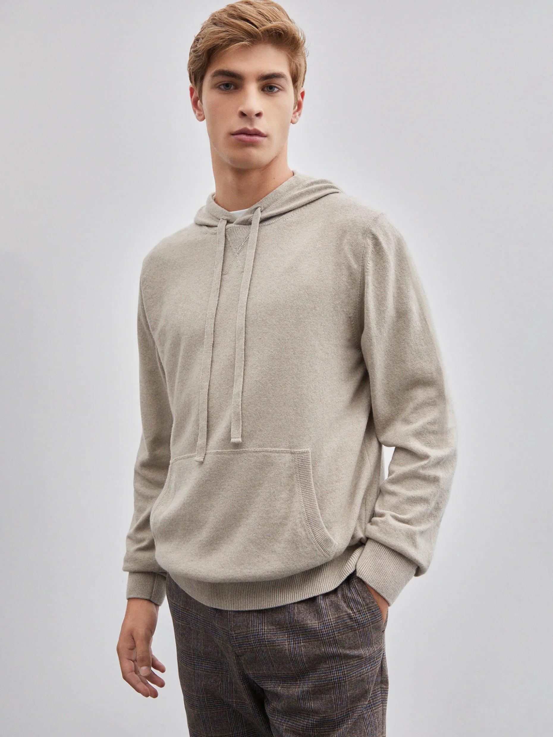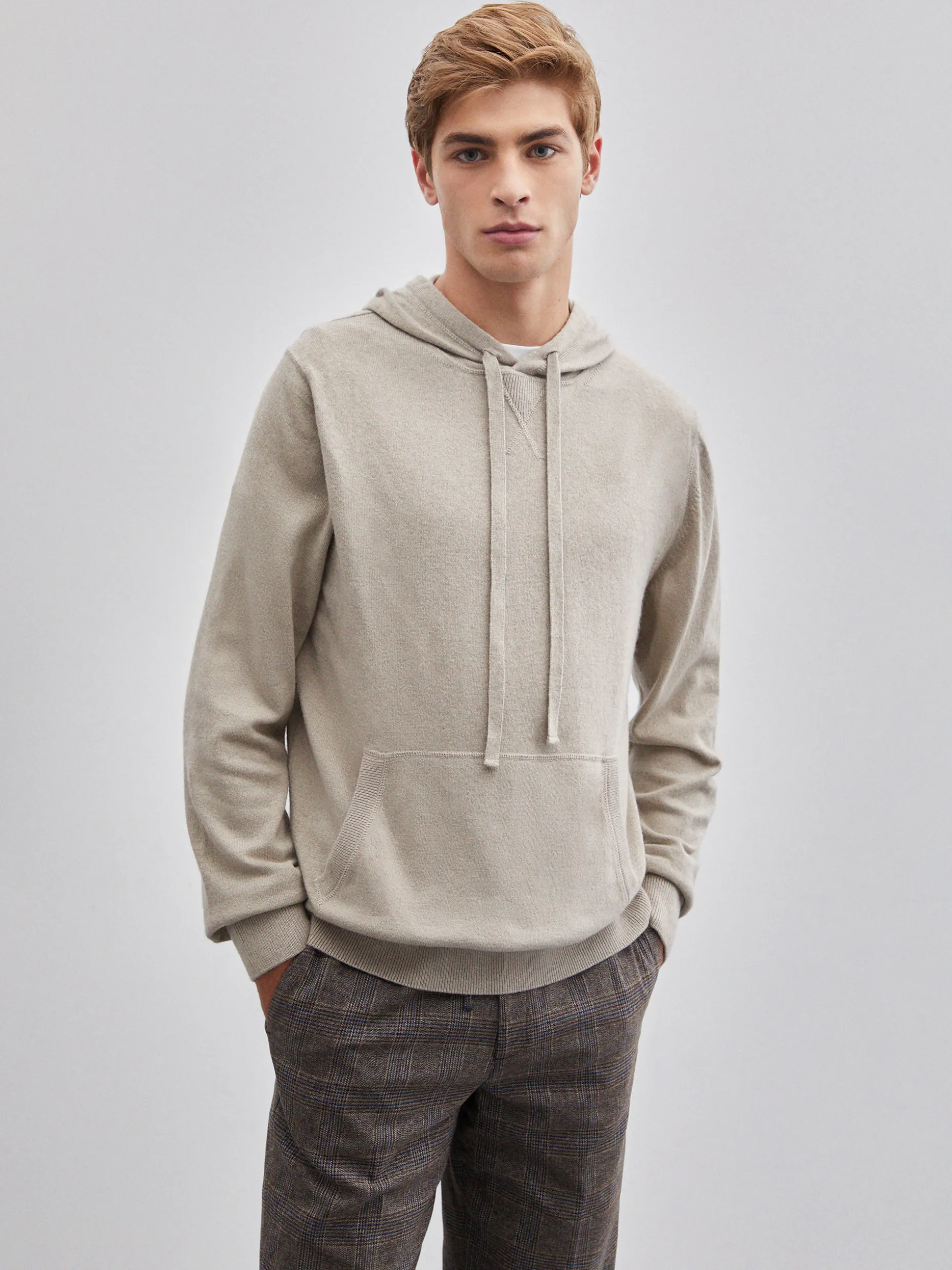 Sweatshirt com capuz confecionada em lã e caxemira. Cordões espalmados à cor. Detalhe em baixo com etiqueta de camurça personalizada.