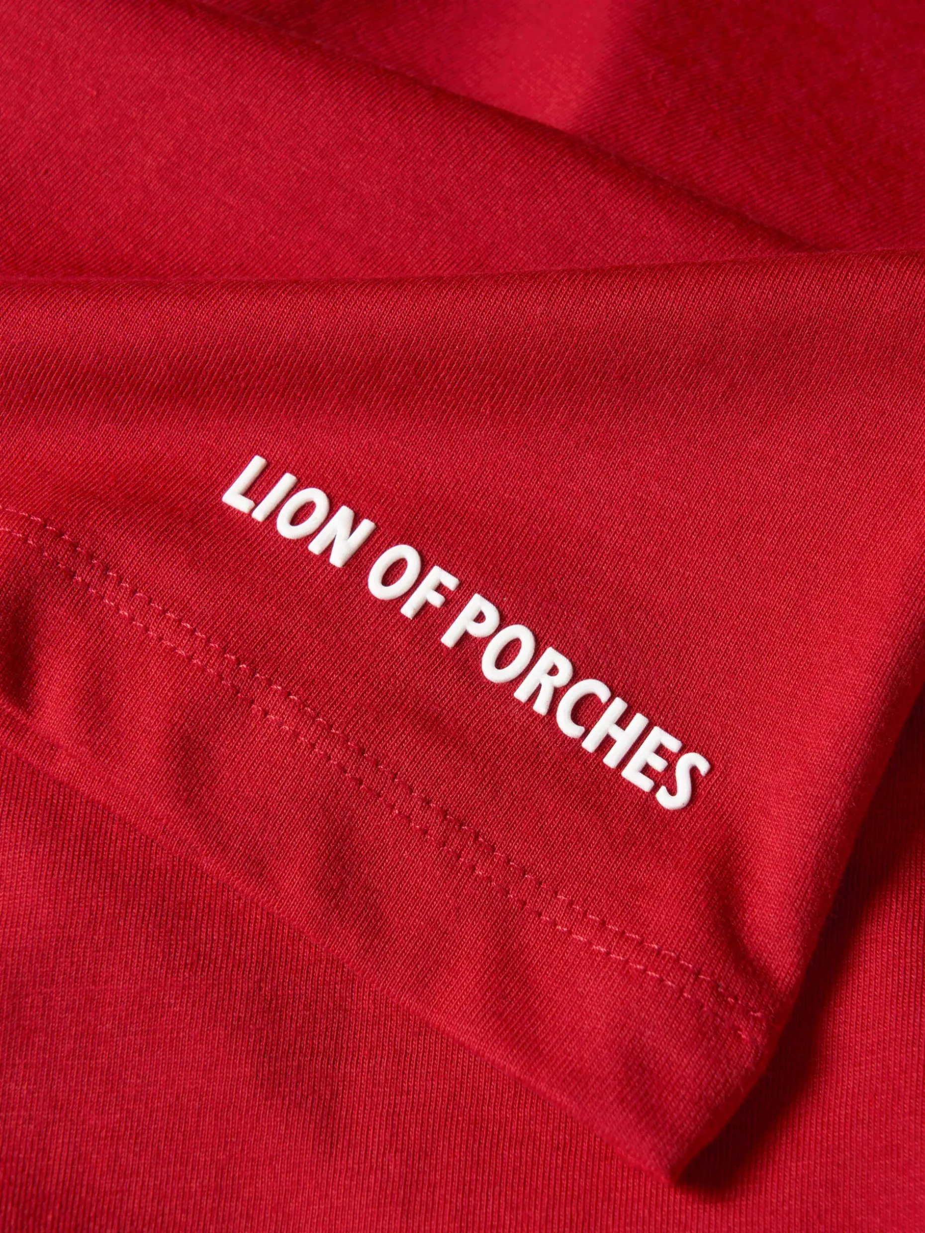 T-shirt básica com decote em V. Branding Lion of Porches com relevo na base, junto à bainha.
