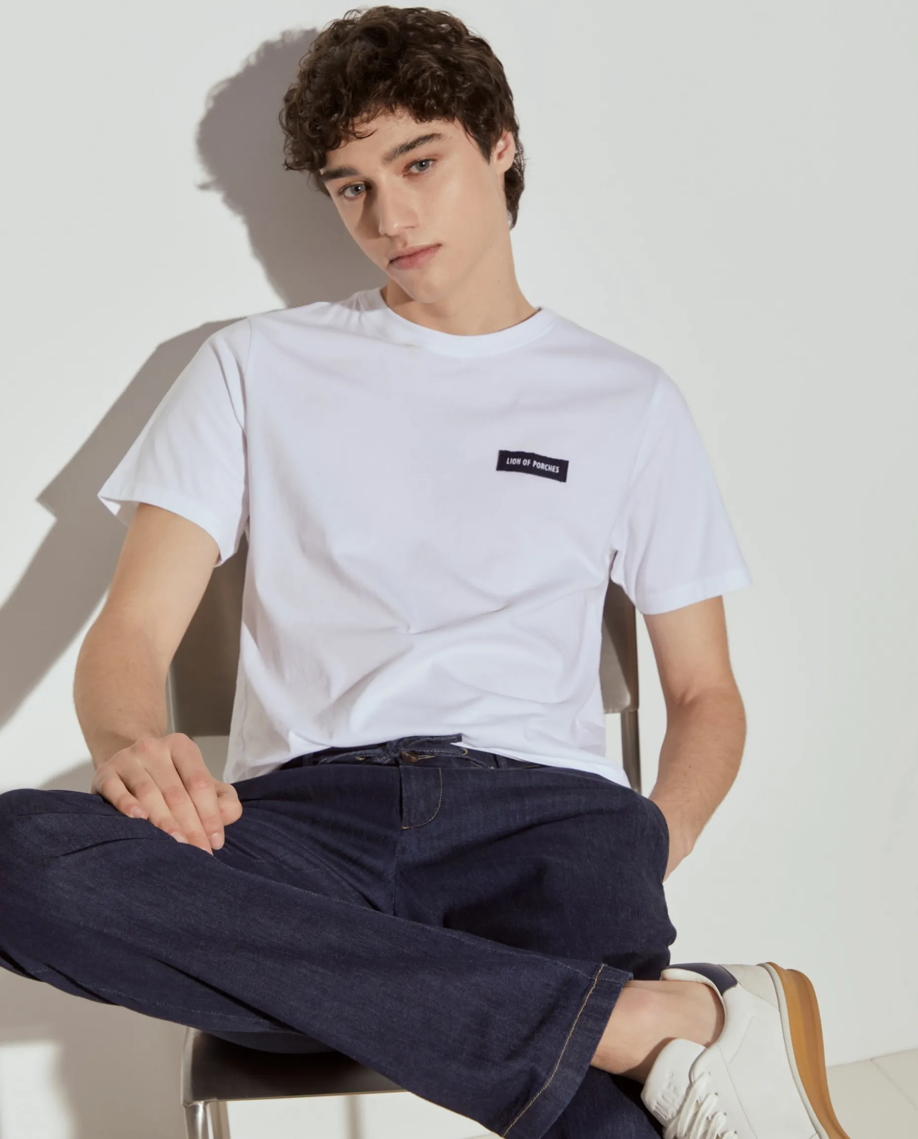 T-shirt básica, de manga curta e gola redonda. Fita de sarja no peito com bordado Lion of Porches em contraste de cor.