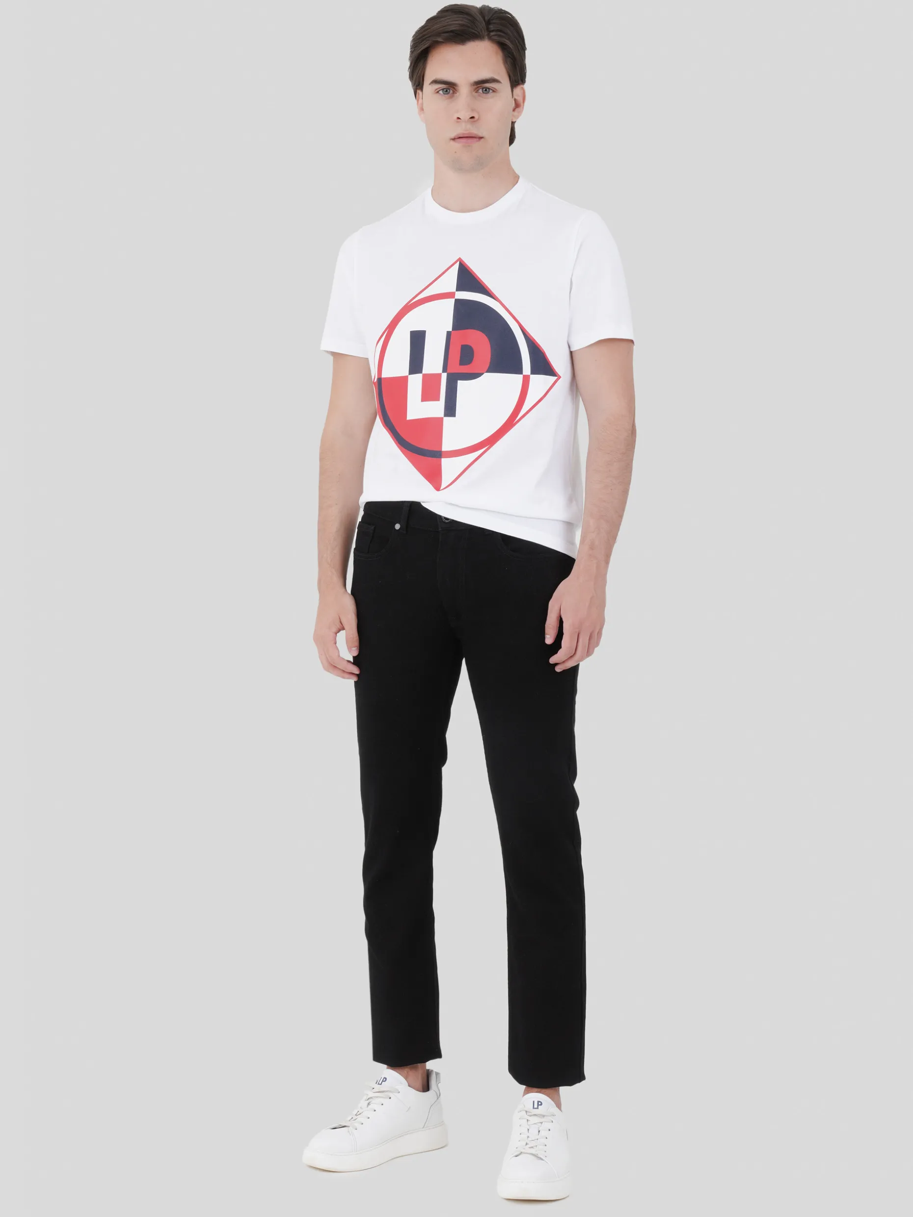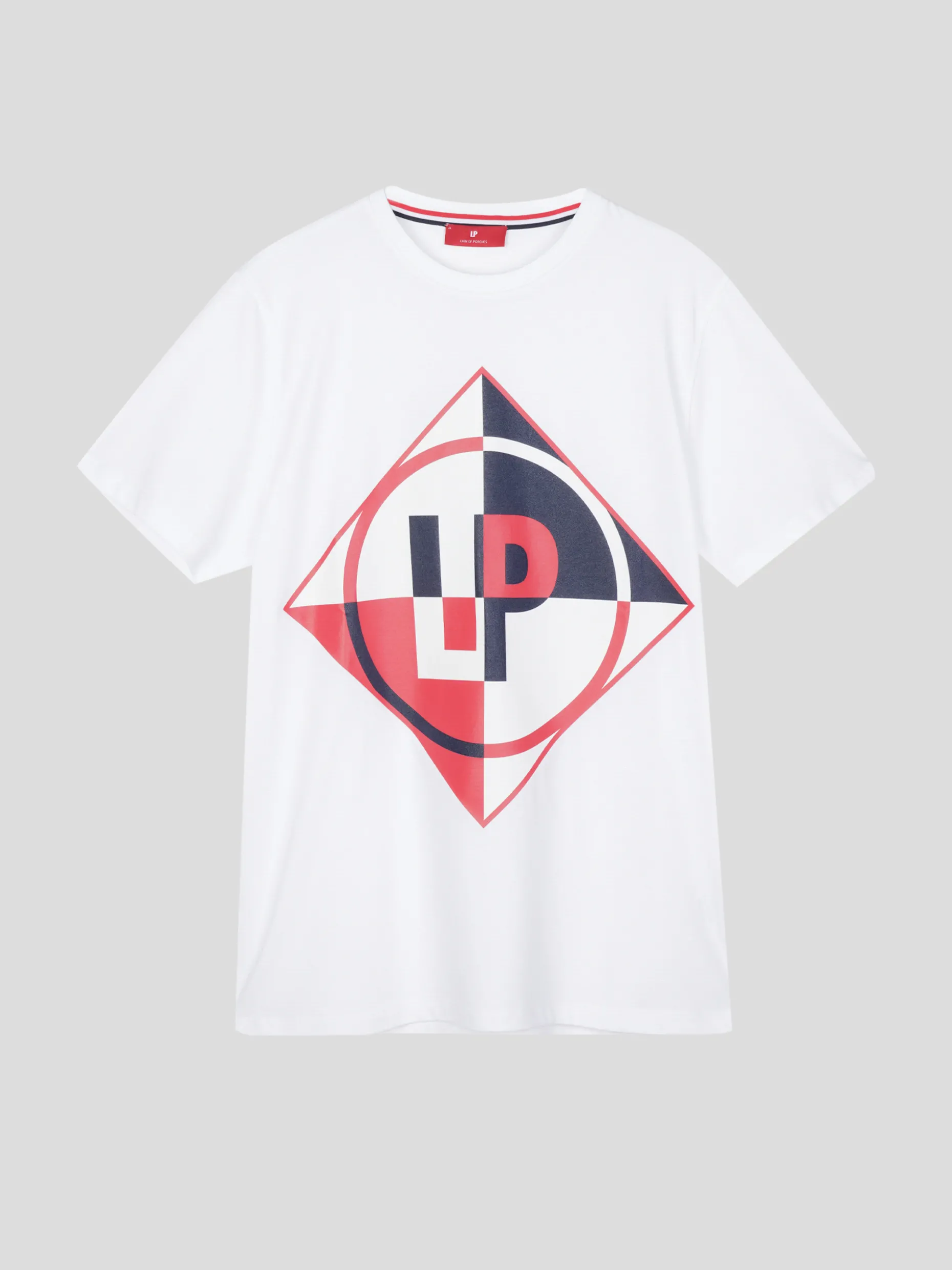 T-shirt com estampado “LP” no peito e fita tricolor corporativa da marca aplicada no interior do decote.