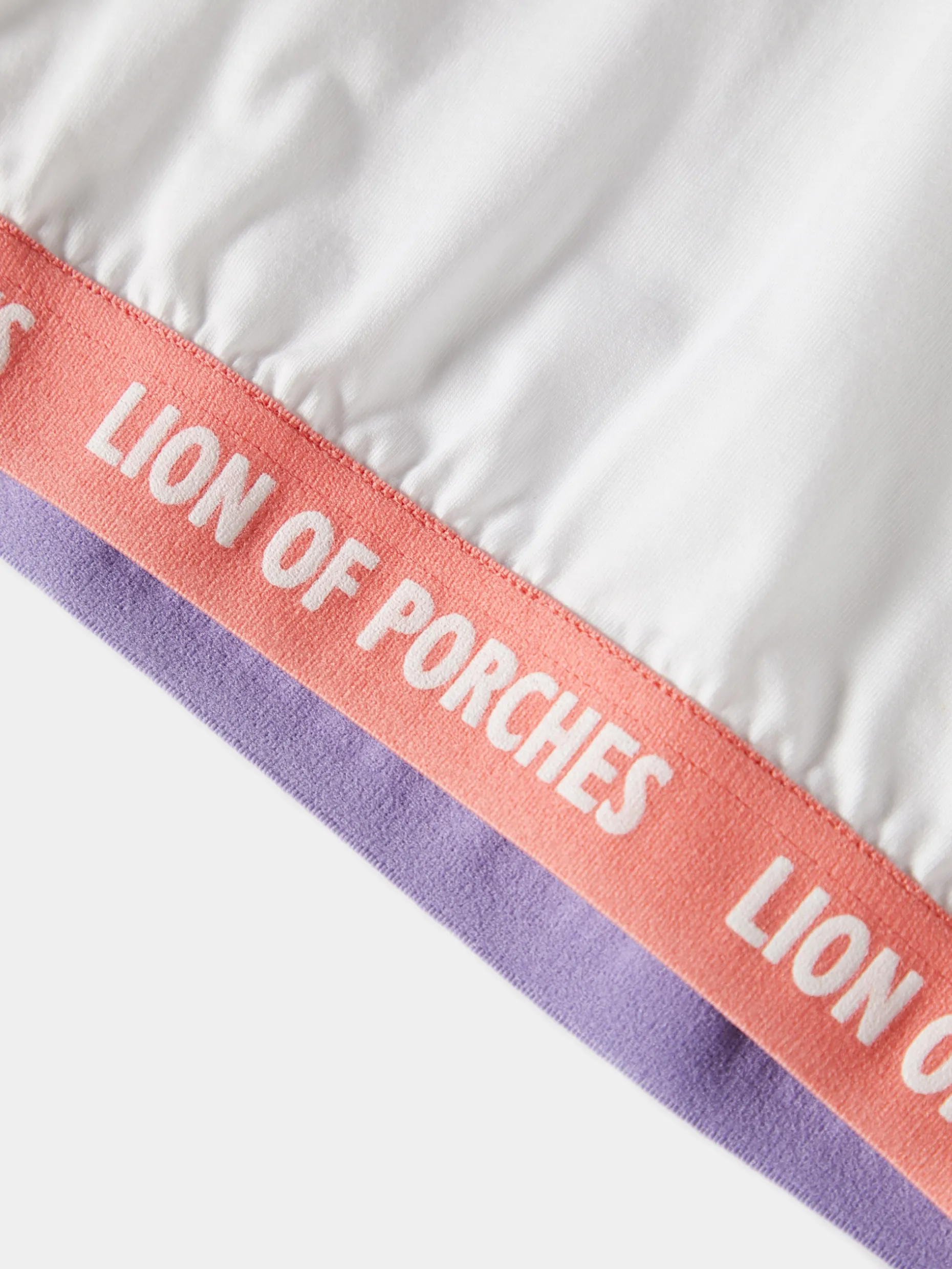 T-shirt cropped de manga curta em balão que finaliza com fita de cor diferente em cada manga. Pormenor semelhante na cintura com fita elástica e branding Lion of Porches. A gola é redonda. É confecionada, na totalidade, em algodão para maior conforto e suavidade. Para um total look, veja também os calções de malha, da mesma coleção.