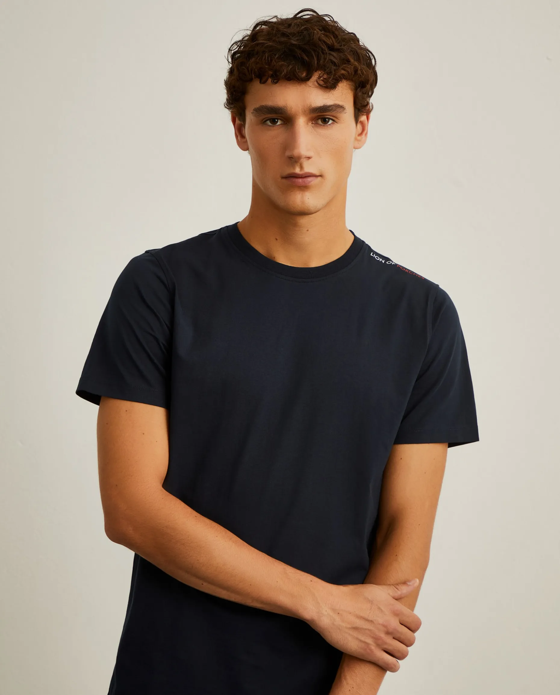 Esteja confortável e elegante em qualquer situação com esta t-shirt de manga curta. Em 100% de algodão, possui um estampado Lion of Porches no ombro em contraste.