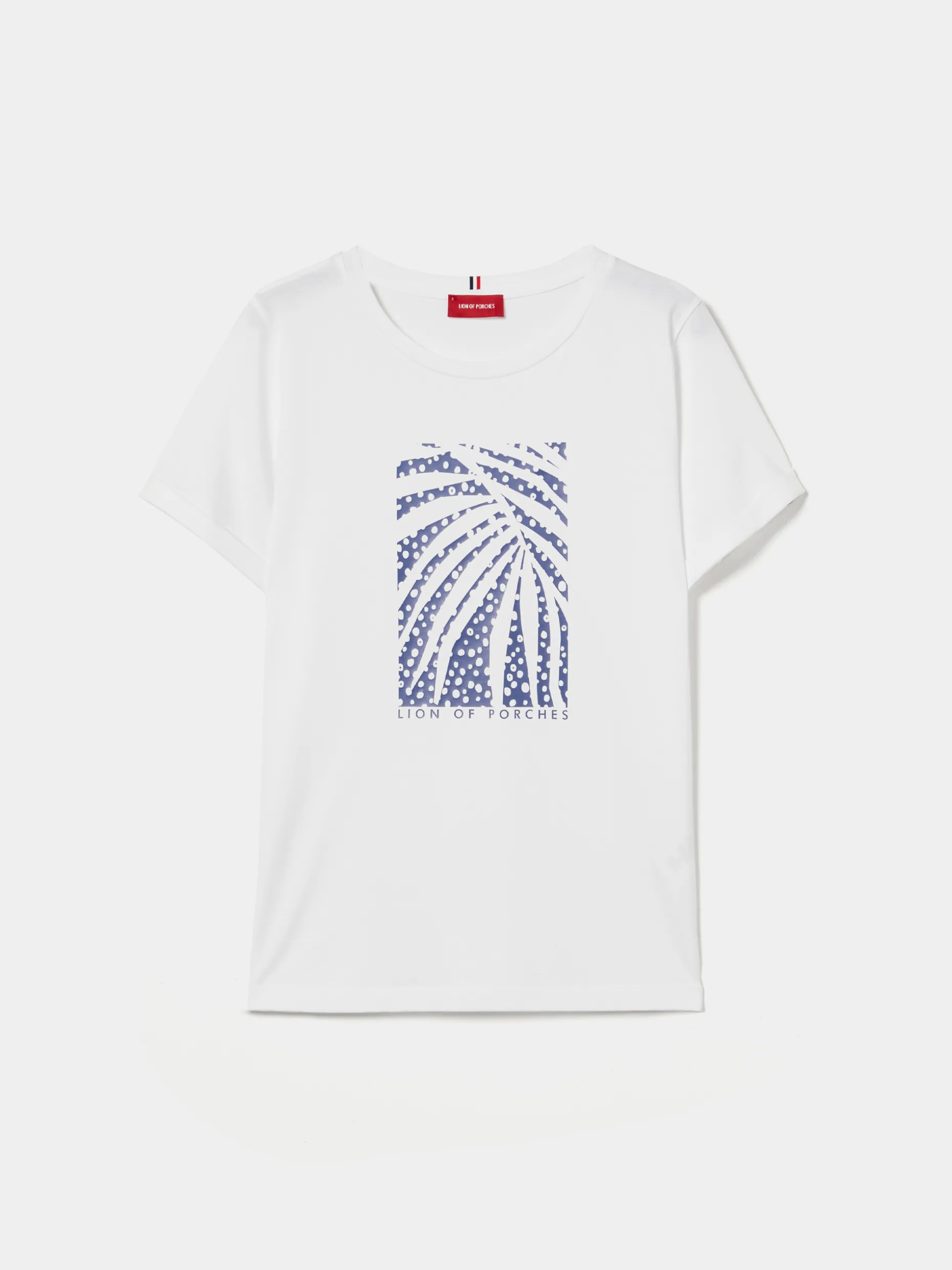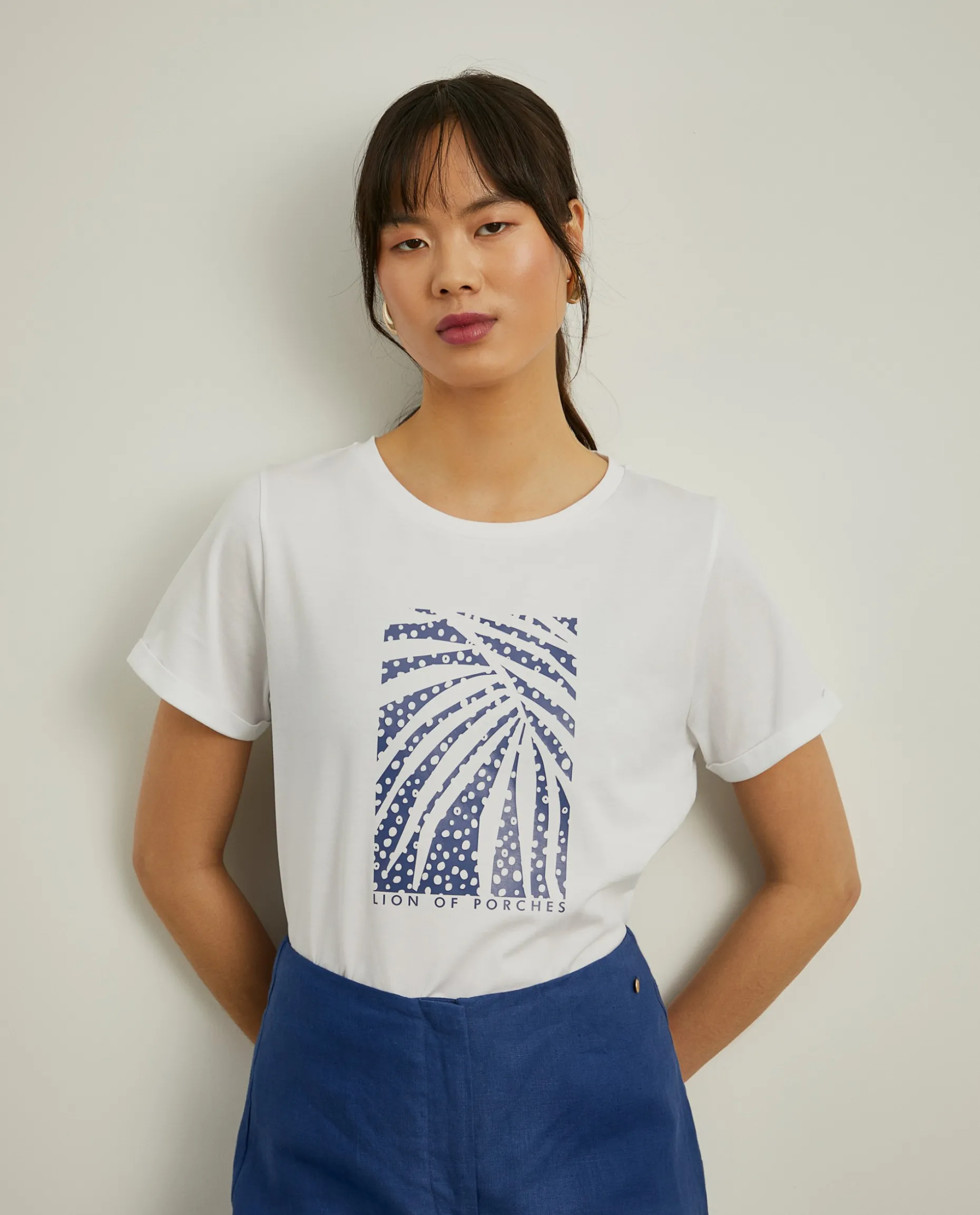 T-shirt de manga curta com estampado de folha de palmeira e bolinhas na frente. A gola é redonda. É confecionada, na totalidade, em algodão para maior conforto e suavidade.