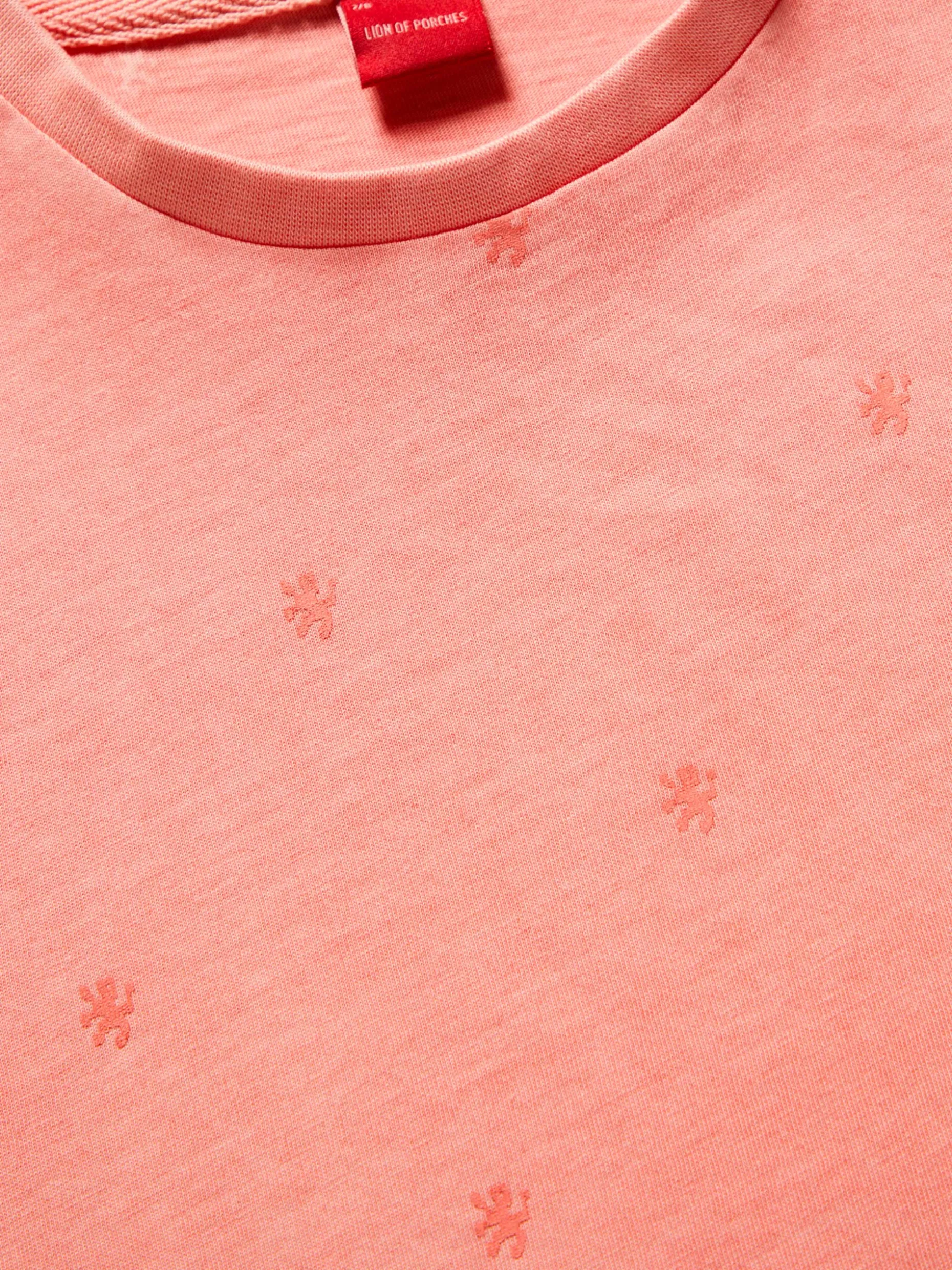 T-shirt de manga curta com padrão de leões num tom mais escuro que a base. A gola é redonda. É confecionada com recurso à técnica garment dye, que consiste no tingimento após a confeção, resultando numa cor única, um toque mais suave e um visual casualmente sofisticado.