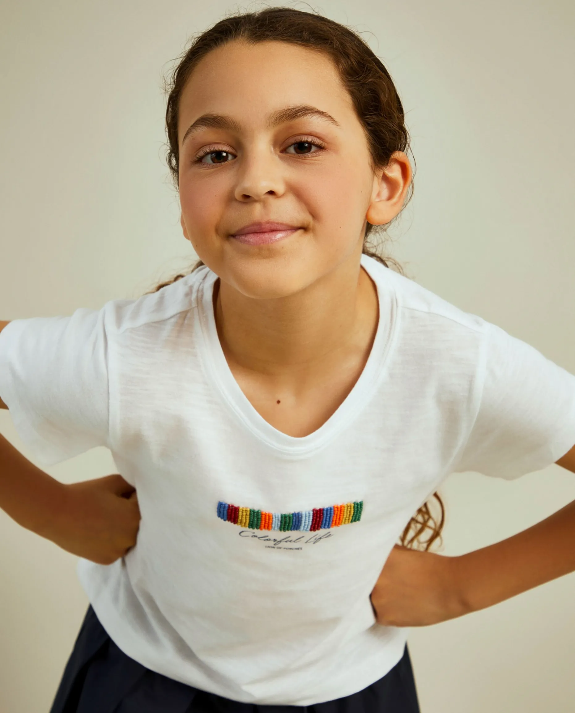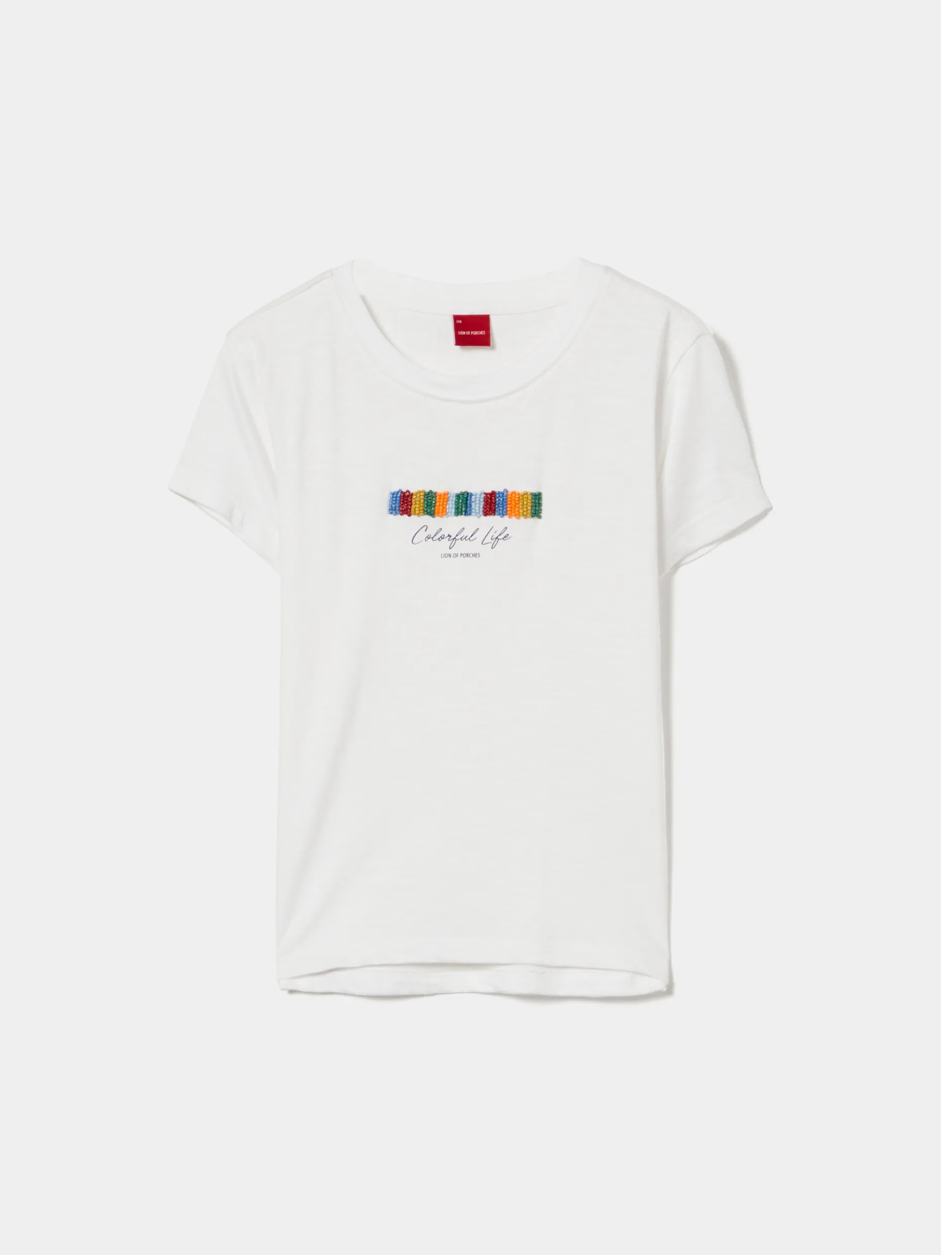 T-shirt de manga curta com mensagem e barra de missangas coloridas no peito. A gola é redonda. É confecionada, na totalidade, em algodão para maior conforto e suavidade.