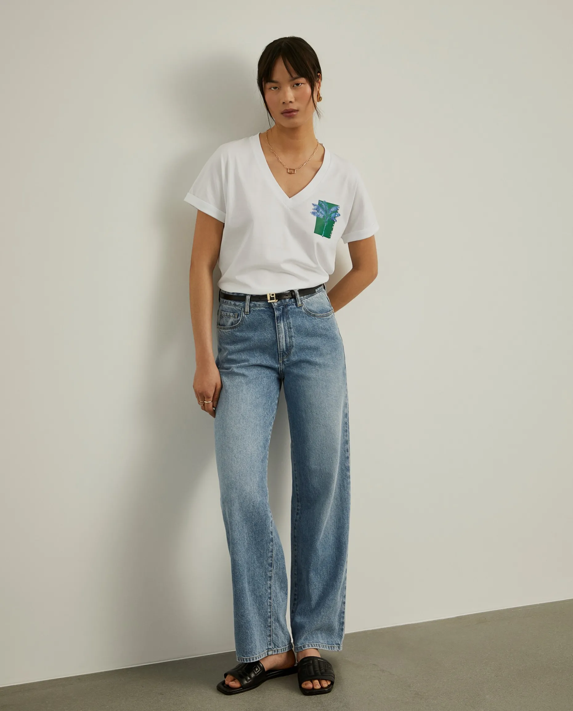 T-shirt de manga curta com decote em V. Pormenor de estampado de palmeira em contraste no peito. É confecionada, na totalidade, em algodão para maior conforto e suavidade.