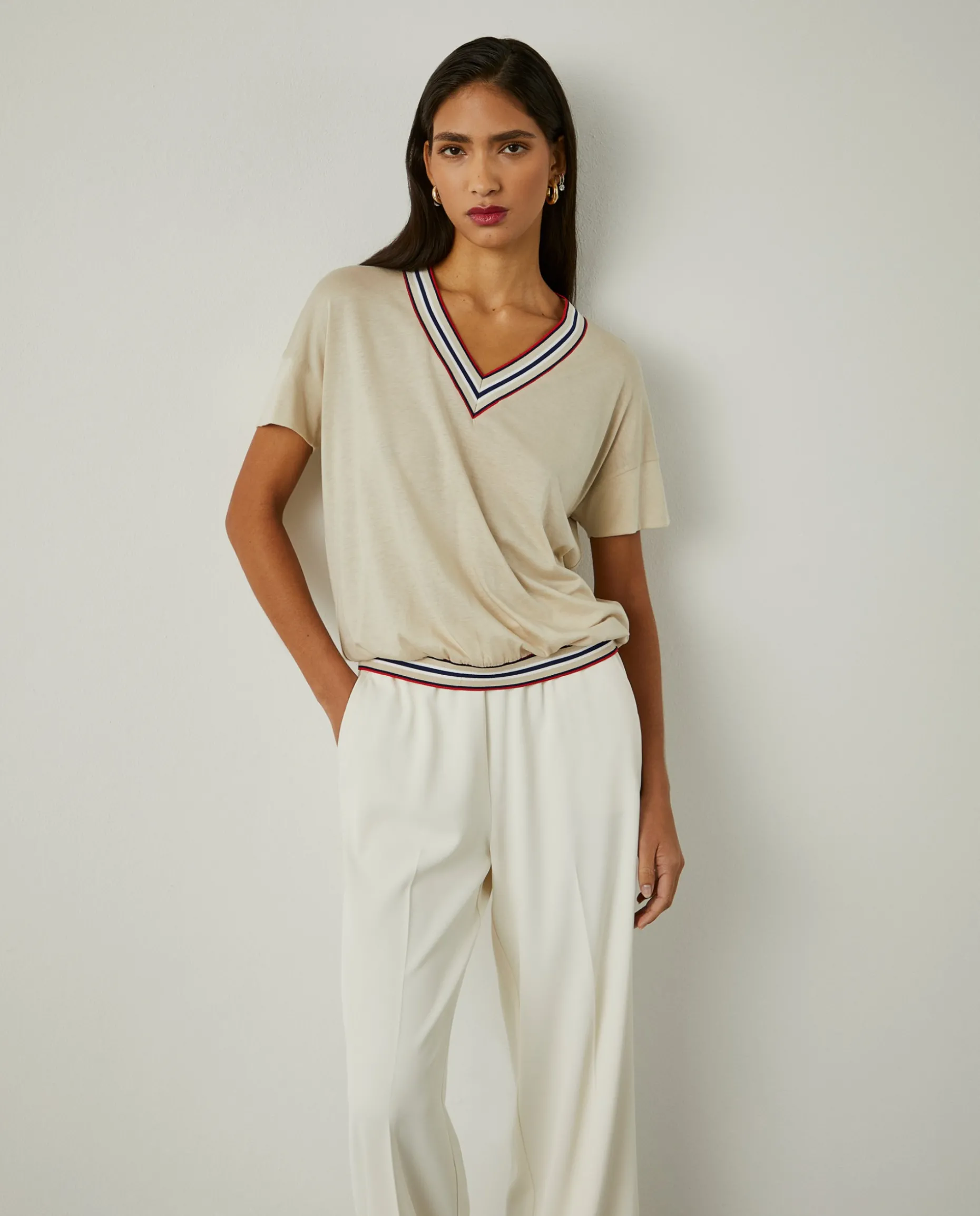 Para um look leve e descontraído, opte por esta t-shirt de manga curta com decote em V. Pormenor diferenciador de base e decote canelados com riscas em contraste. Disponível em várias cores.