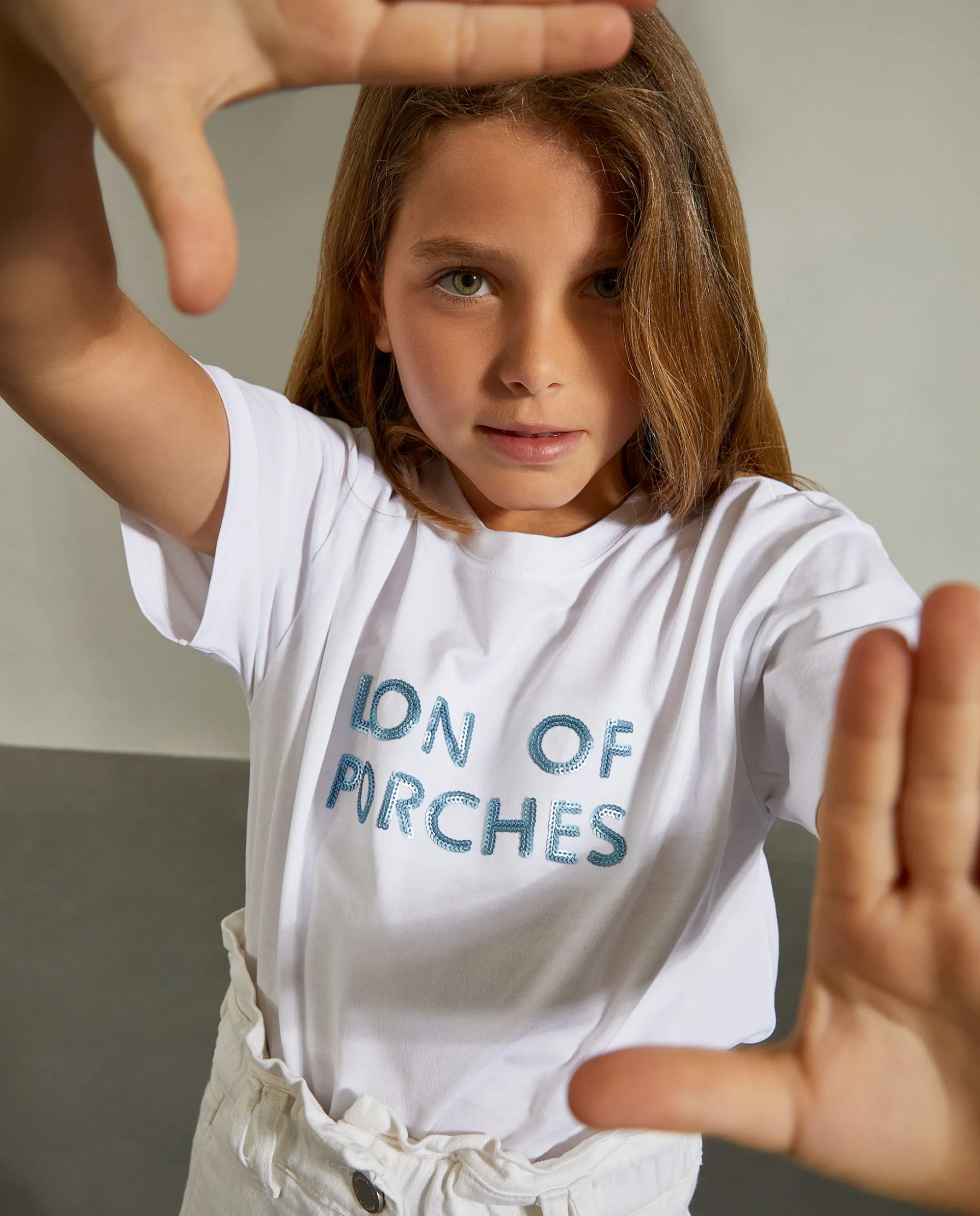 T-shirt oversize de manga curta com estampado Lion of Porches em lantejoulas na frente em contraste.