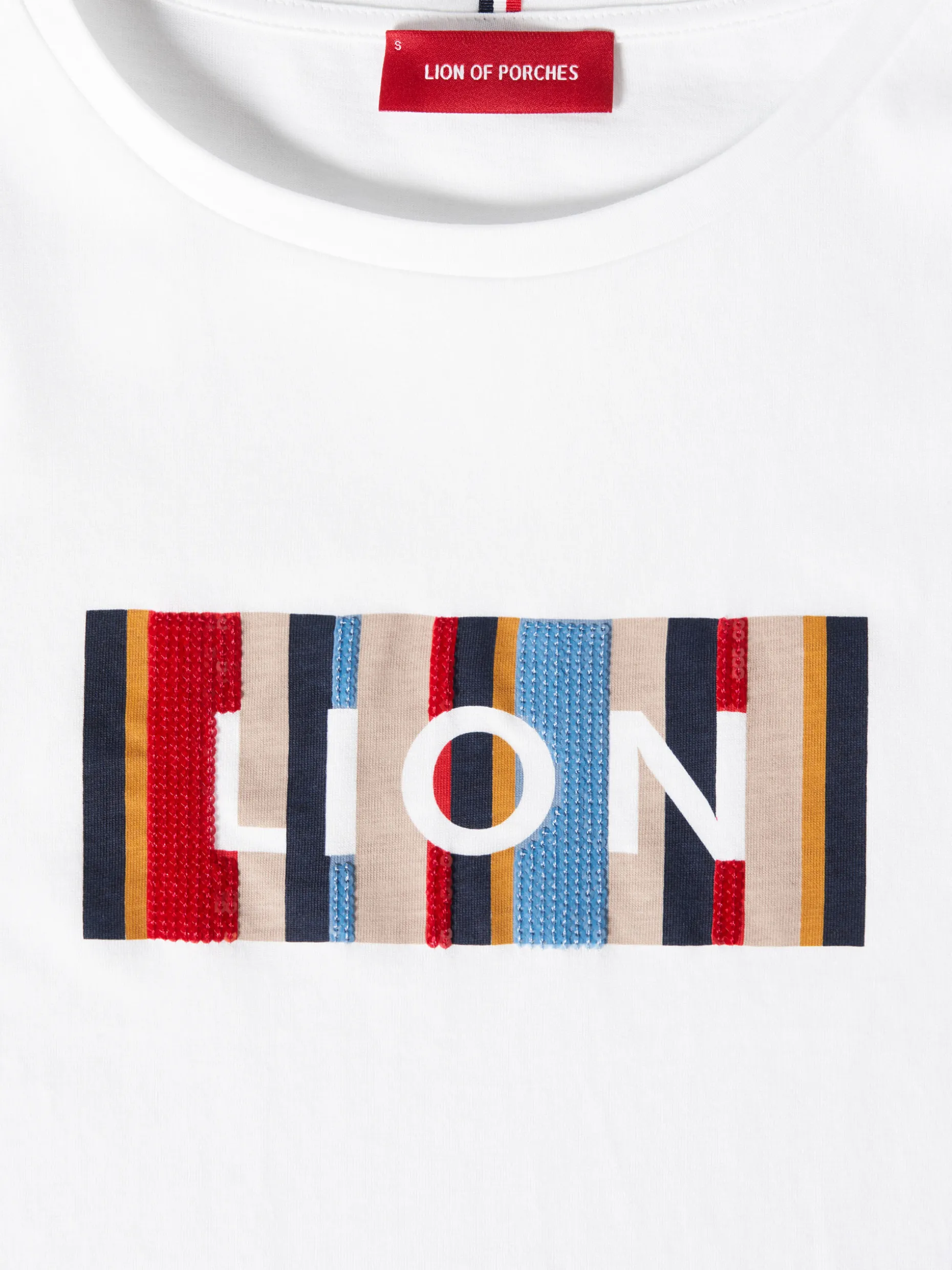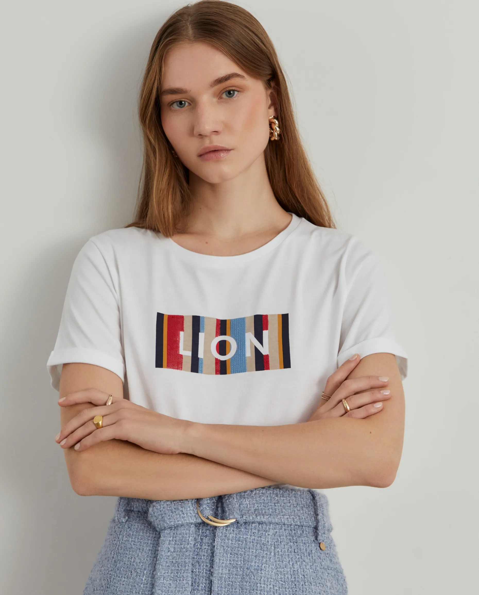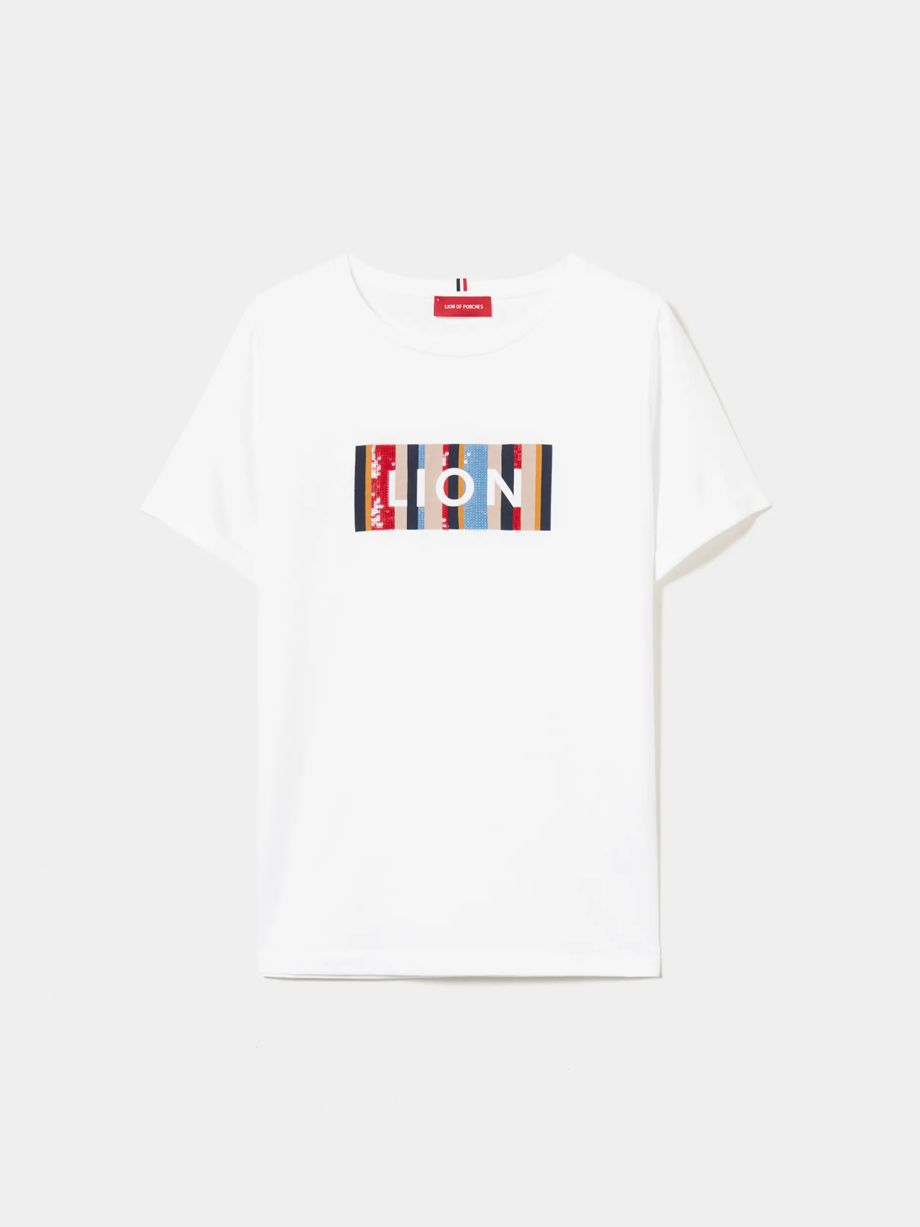 T-shirt de manga curta, em algodão. No peito, estampado Lion com riscas coloridas e aplicação de lantejoulas.