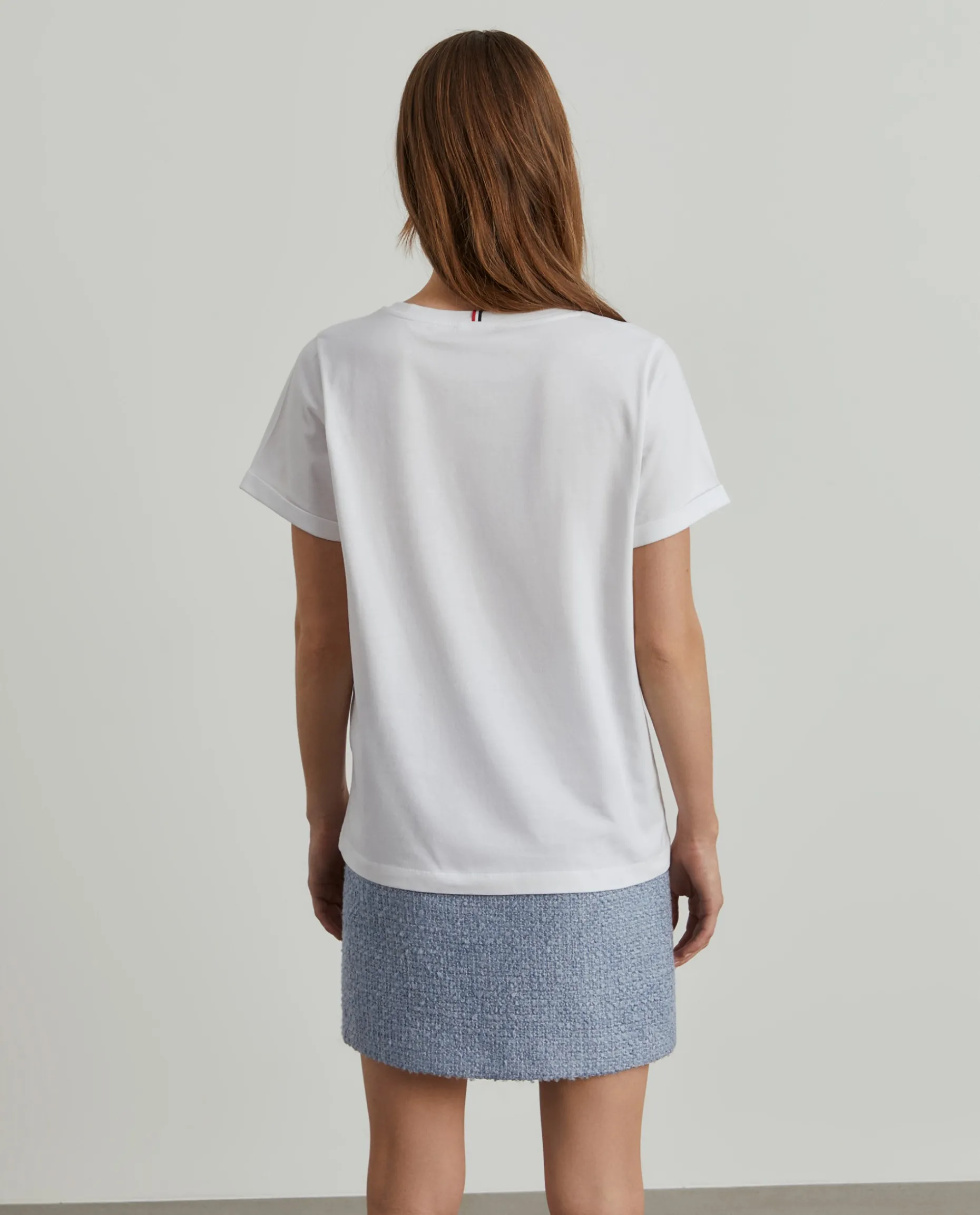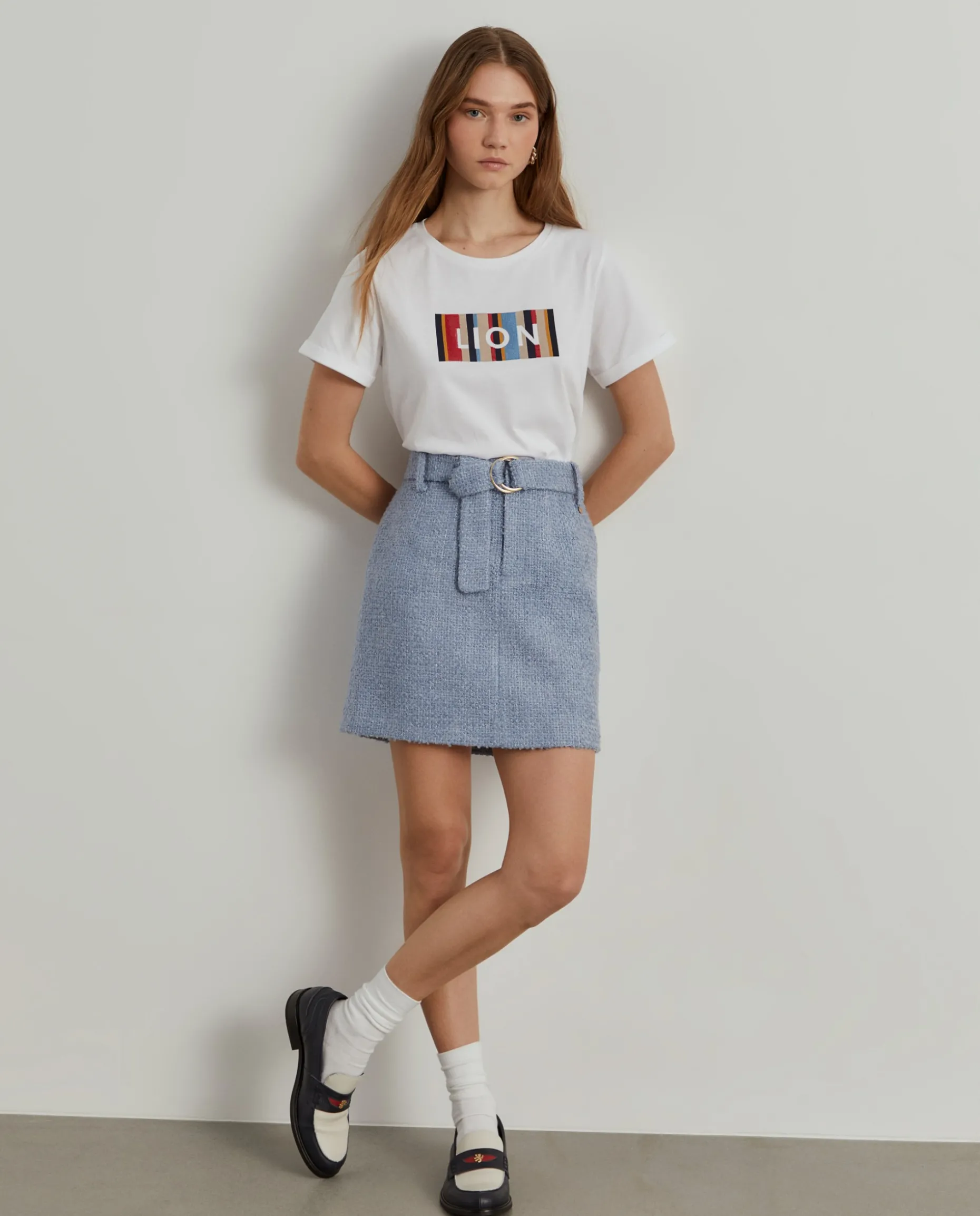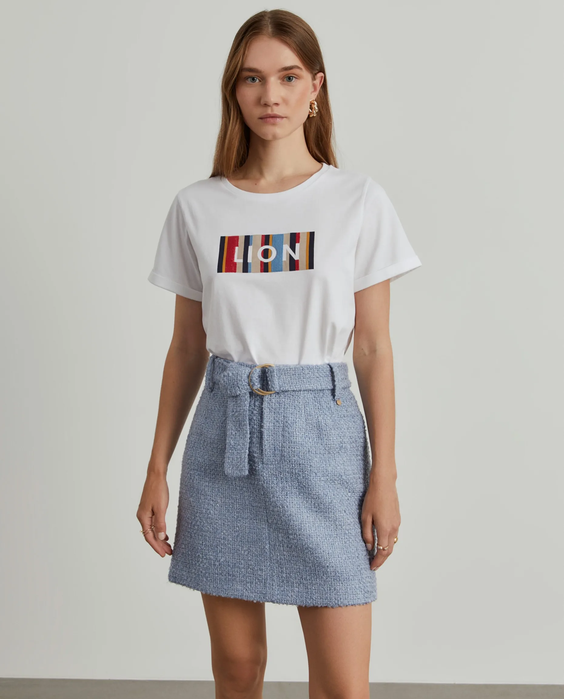 T-shirt de manga curta, em algodão. No peito, estampado Lion com riscas coloridas e aplicação de lantejoulas.