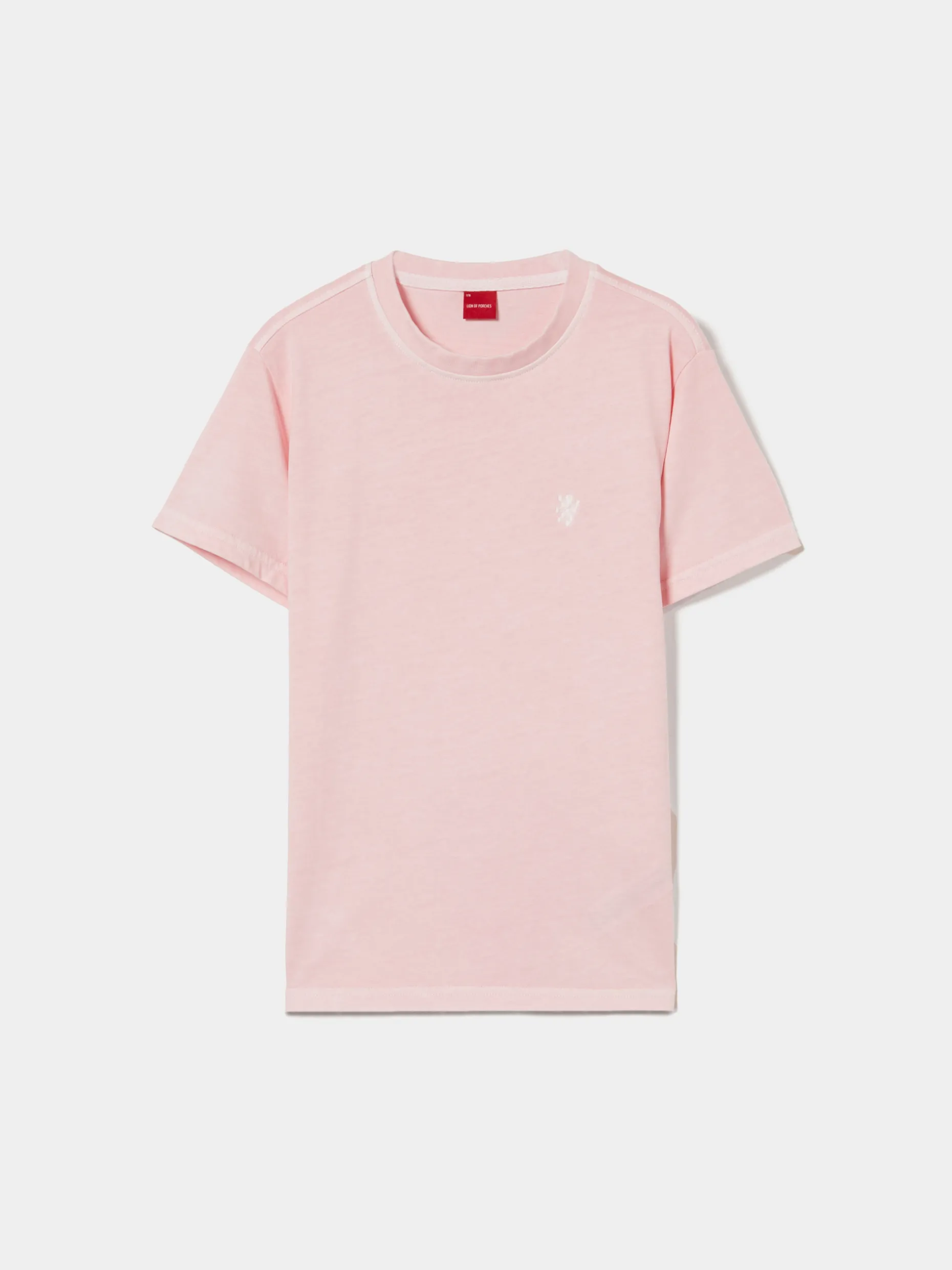 T-shirt de manga curta, de cor lisa, com pequeno leão da marca ao tom no peito. É confecionado com recurso à técnica garment dye, que consiste no tingimento após a confeção, resultando numa cor única, um toque mais suave e um visual casualmente sofisticado. Disponível em várias cores, todas de tons pastel.