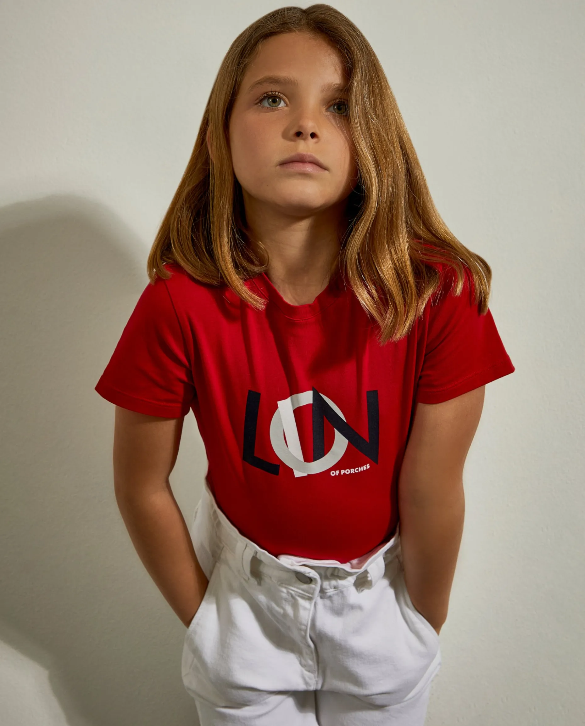T-shirt de manga curta com estampado Lion of Porches na frente em contraste. Detalhe da fita de riscas tricolor na parte de trás da gola.