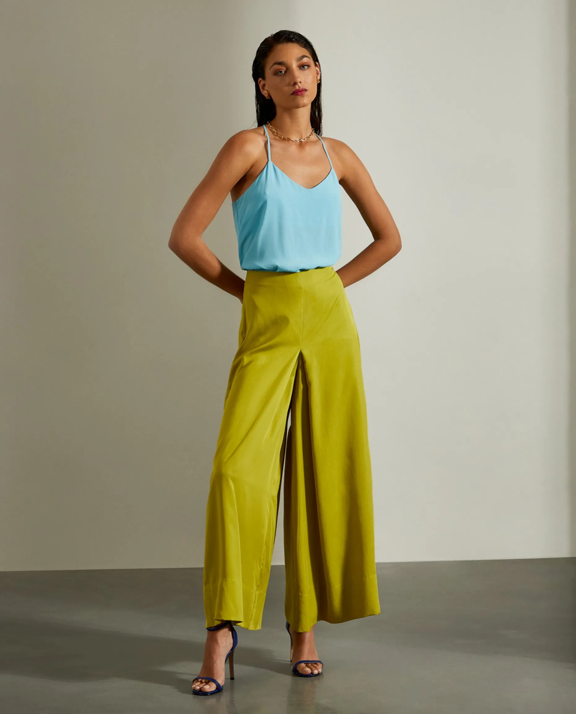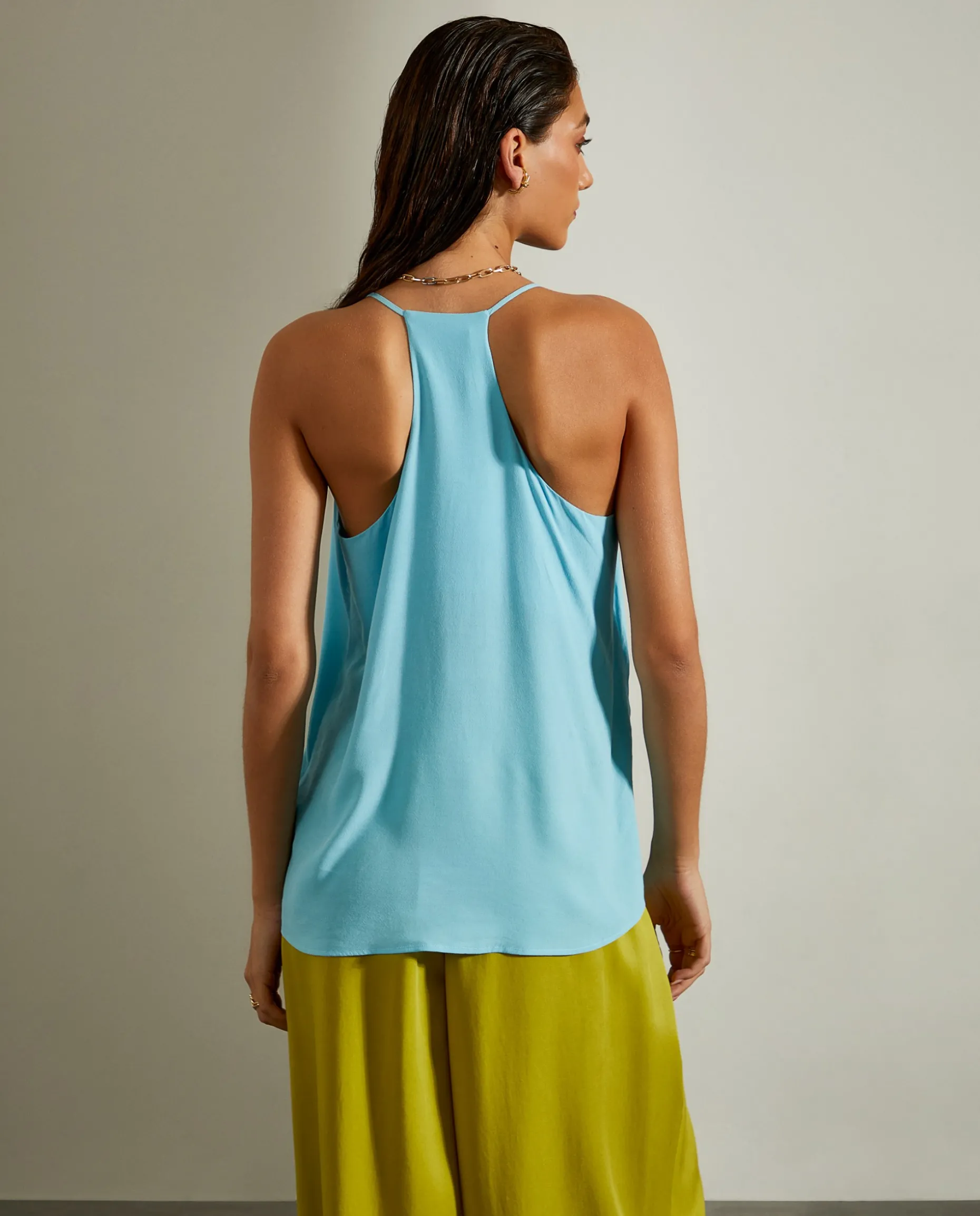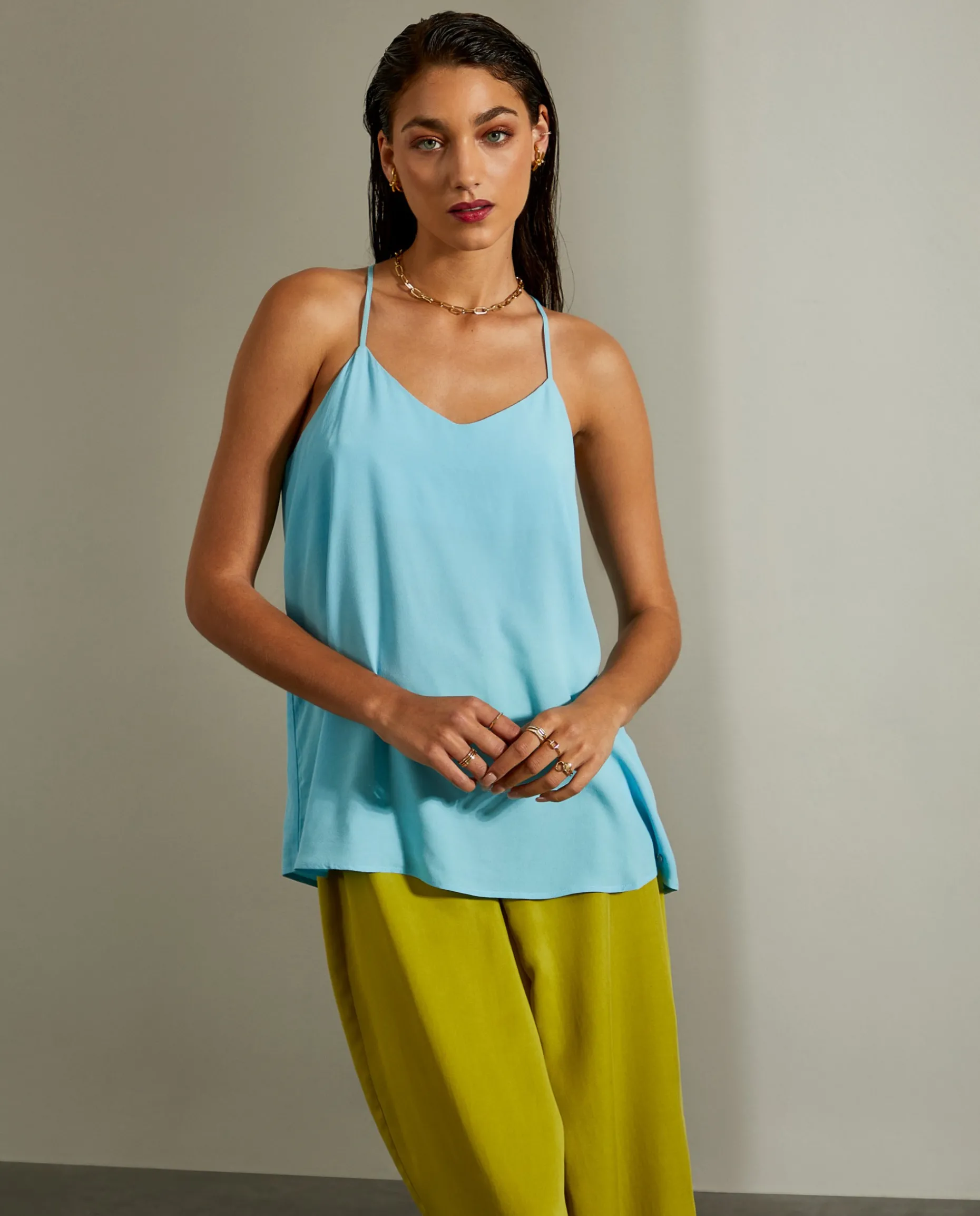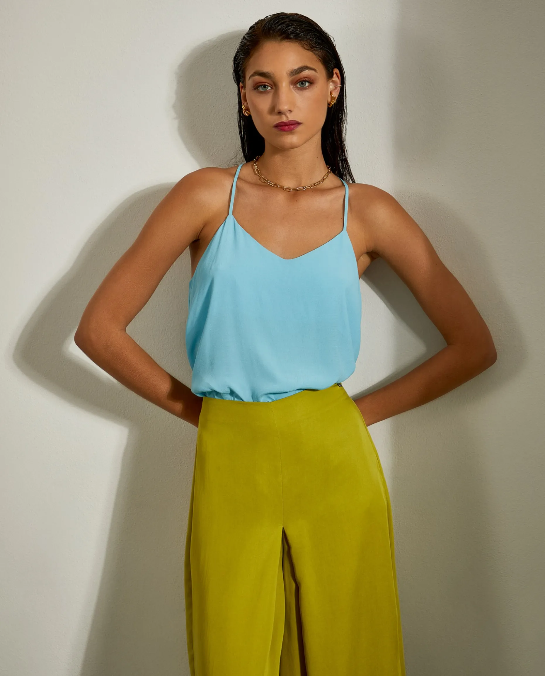 Top fluido, de alças finas, para um look leve e elegante. Decote em V na frente.