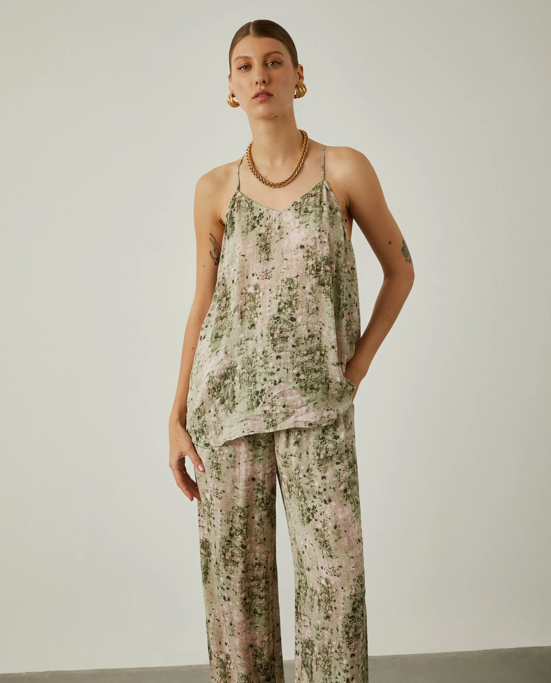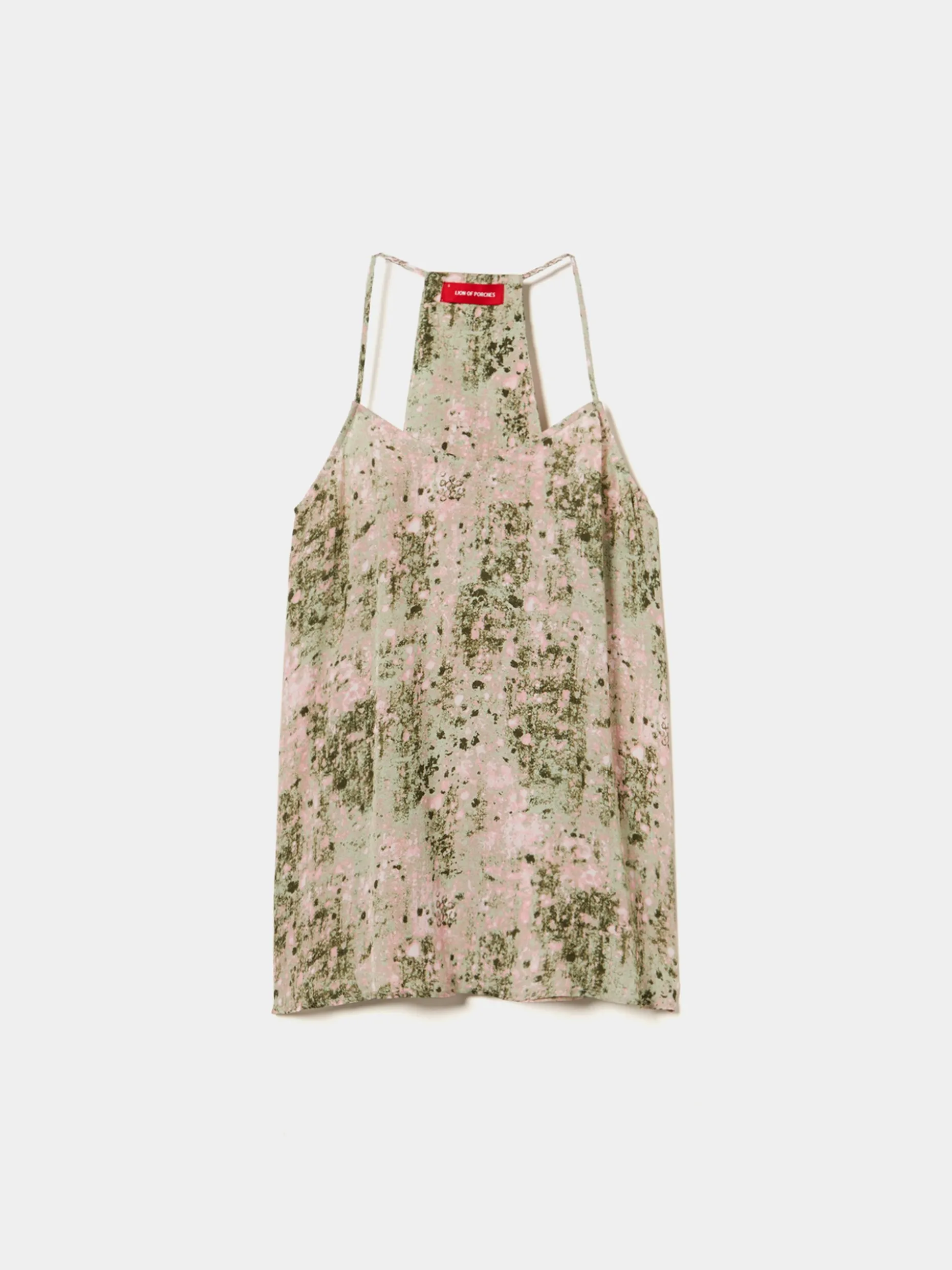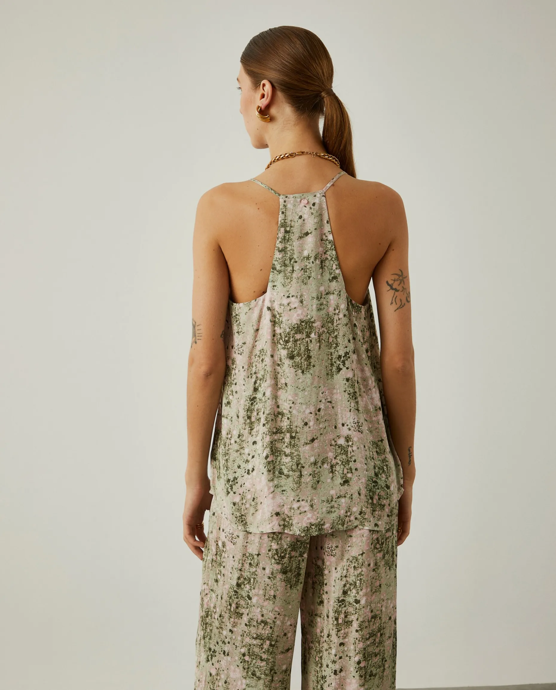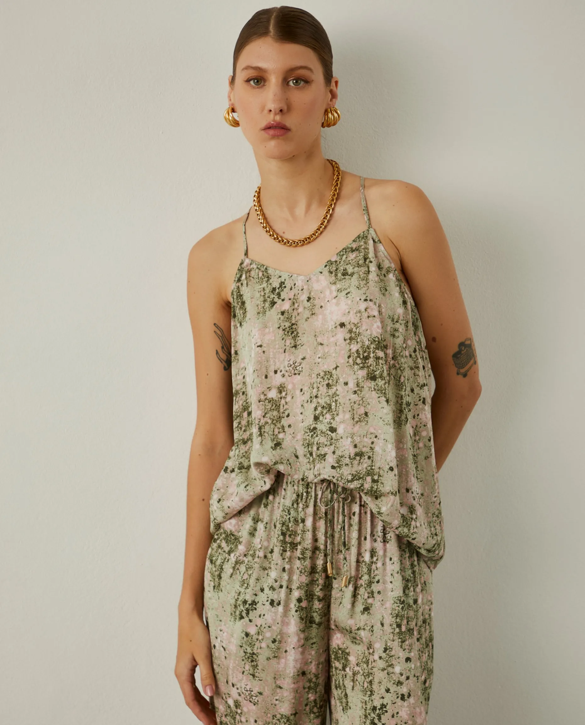 Para um look diferenciador e com muita personalidade, propomos este top fluido, de alças finas, com padrão abstrato colorido. Para um outfit completo, veja também as calças e a camisa da mesma coleção.
