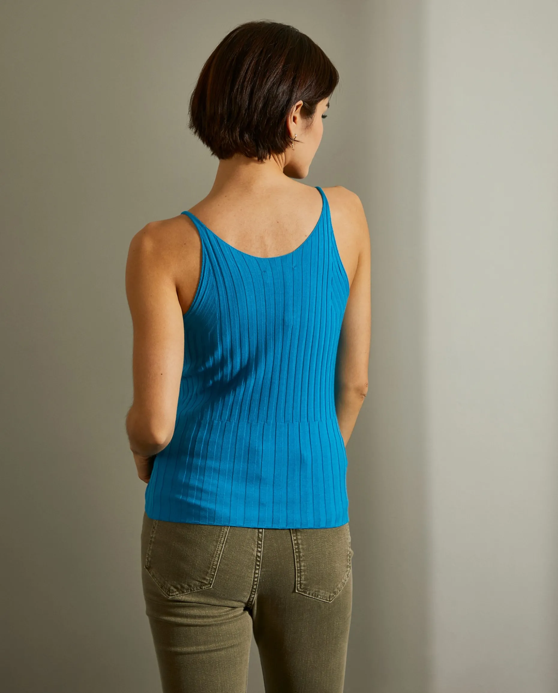 Top singlet de malha canelada. Alça fina e decote em V. Possibilidade de combinar com camisola e cardigan.