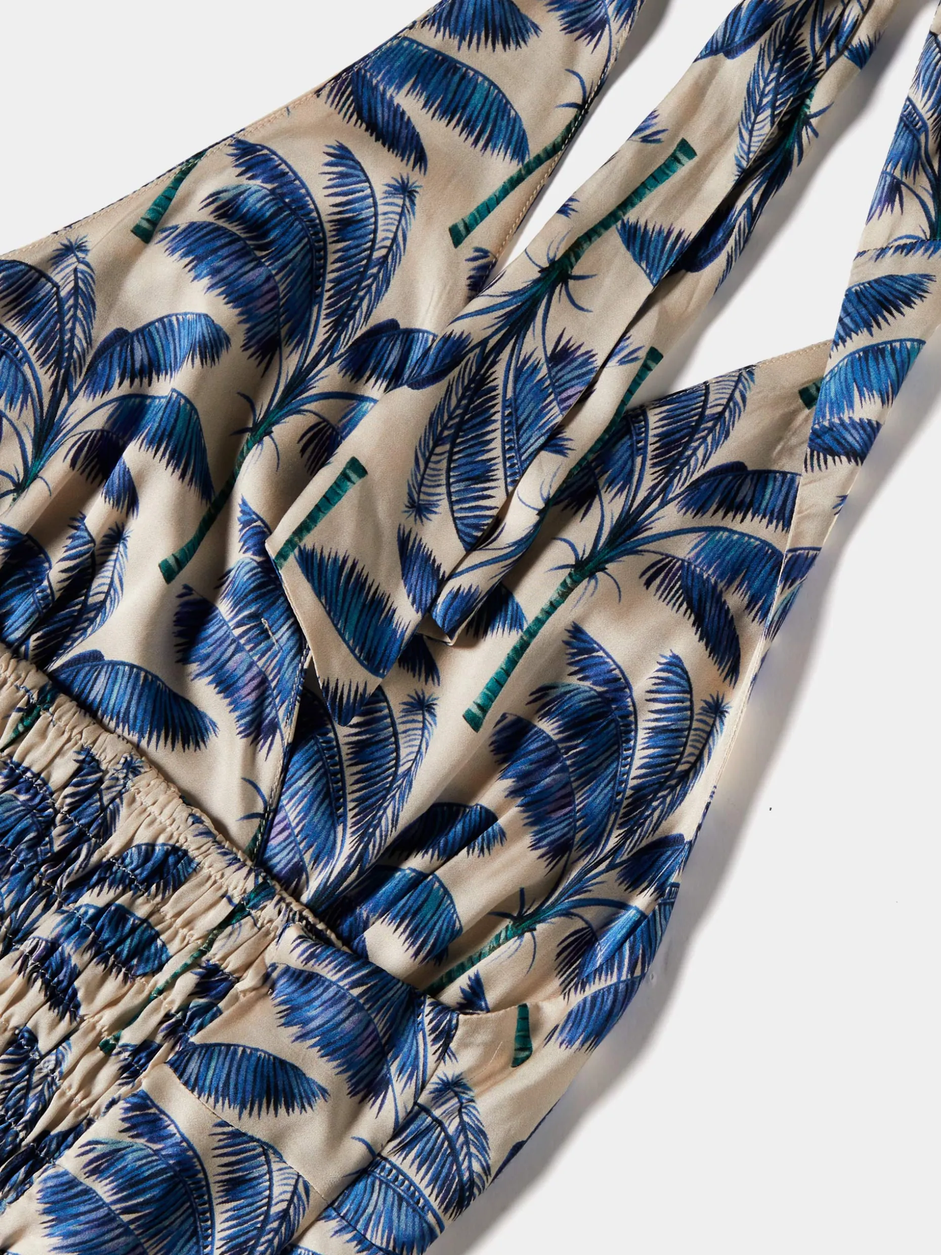 Top halter curto com padrão de palmeiras. Com decote em V e fita, no mesmo tecido e tom, para dar laçada no pescoço. Costas com elástico. Para um total look, veja também as calças pantalona da mesma coleção.