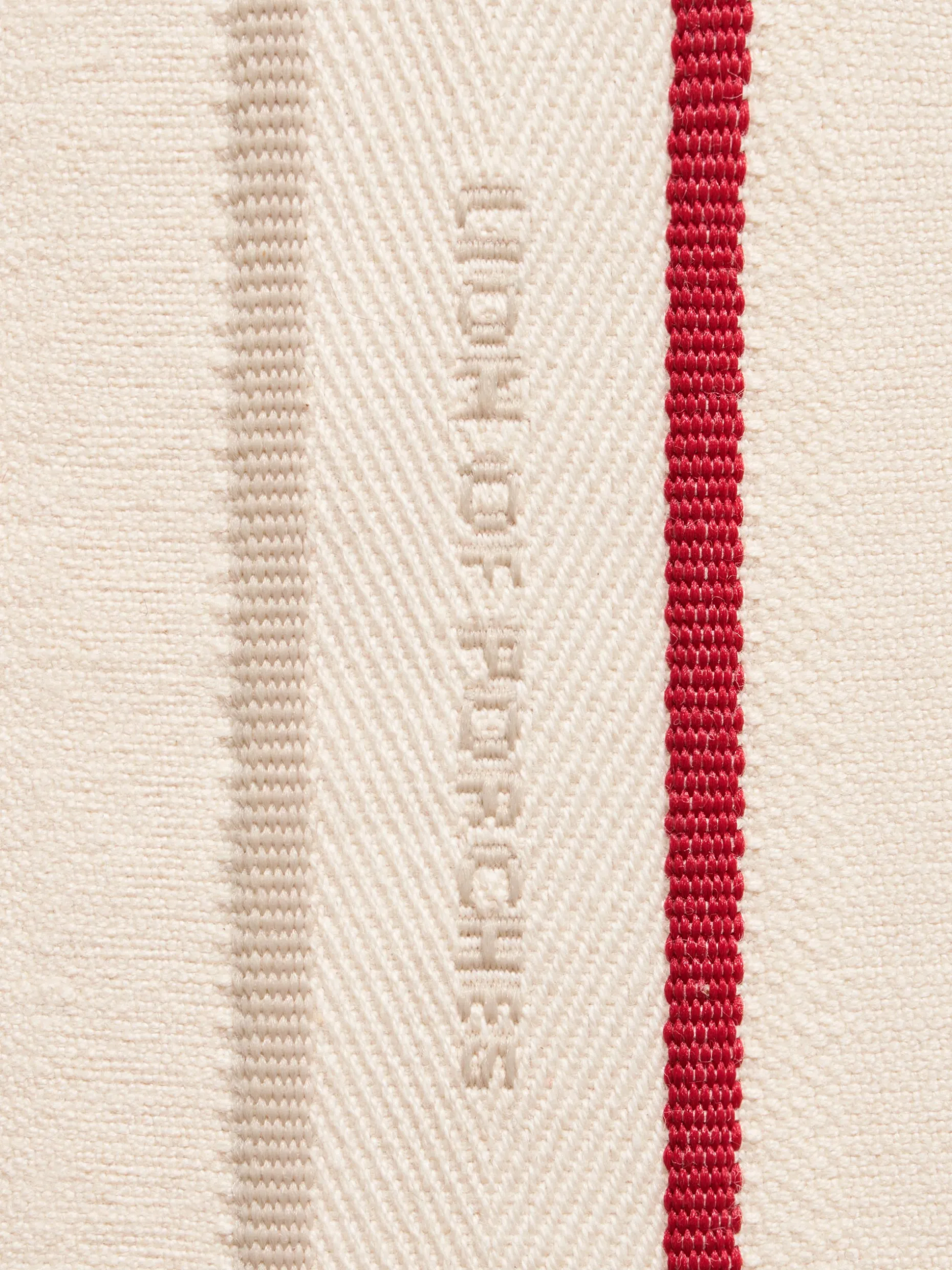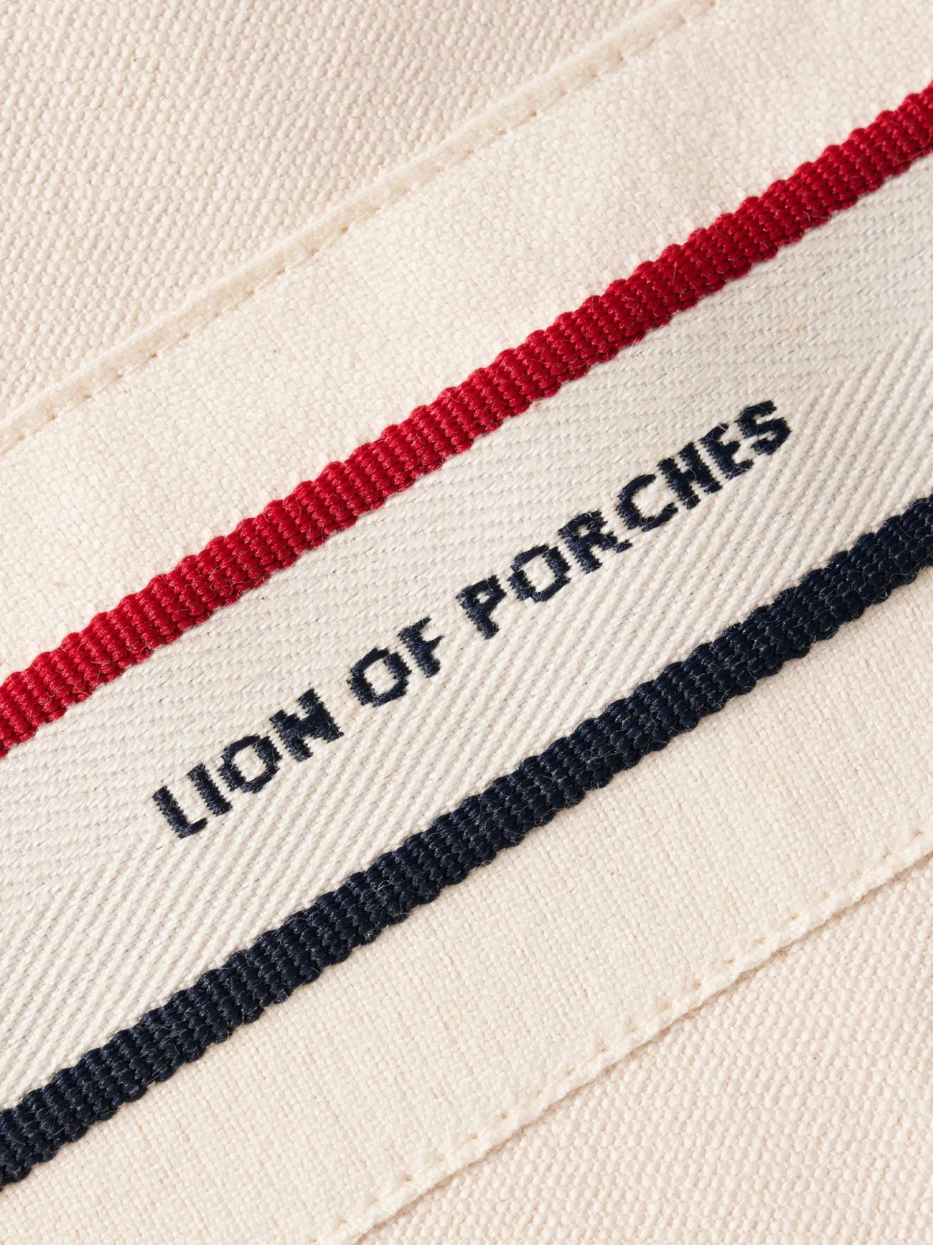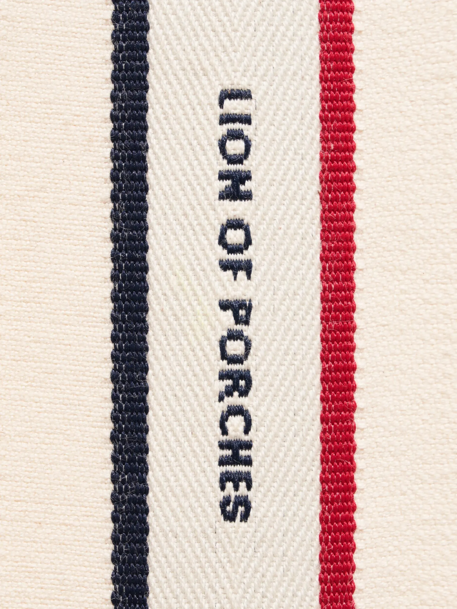 Leve consigo todos os seus essenciais com esta tote bag em canvas. De alça dupla, tem cor lisa à exceção da risca no centro em contraste e logotipo Lion of Porches. Confecionada, na totalidade, em algodão. Nota: há 4 versões desta tote bag, que varia consoante a cor da fita do meio (vermelha e azul; vermelha e bege; fundo caqui com fita vermelha e azul; fita vermelha e azul com logotipo Lion of Porches). O envio da cor é aleatório, não podendo ser escolhido.