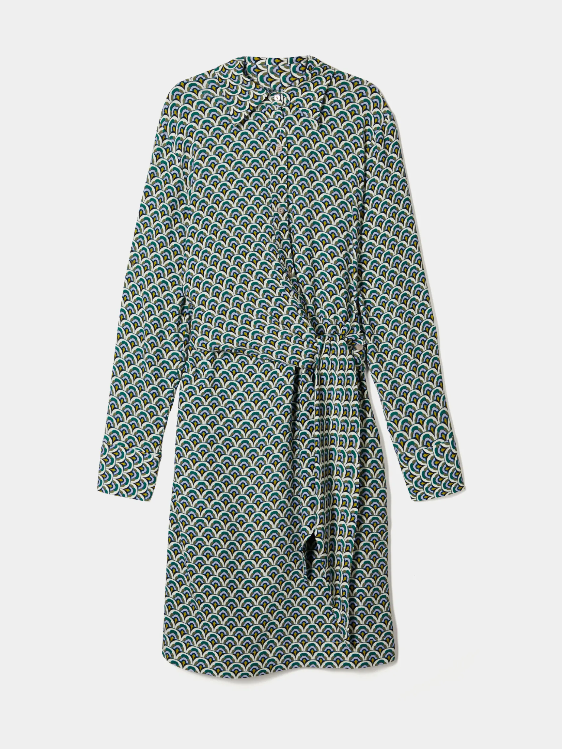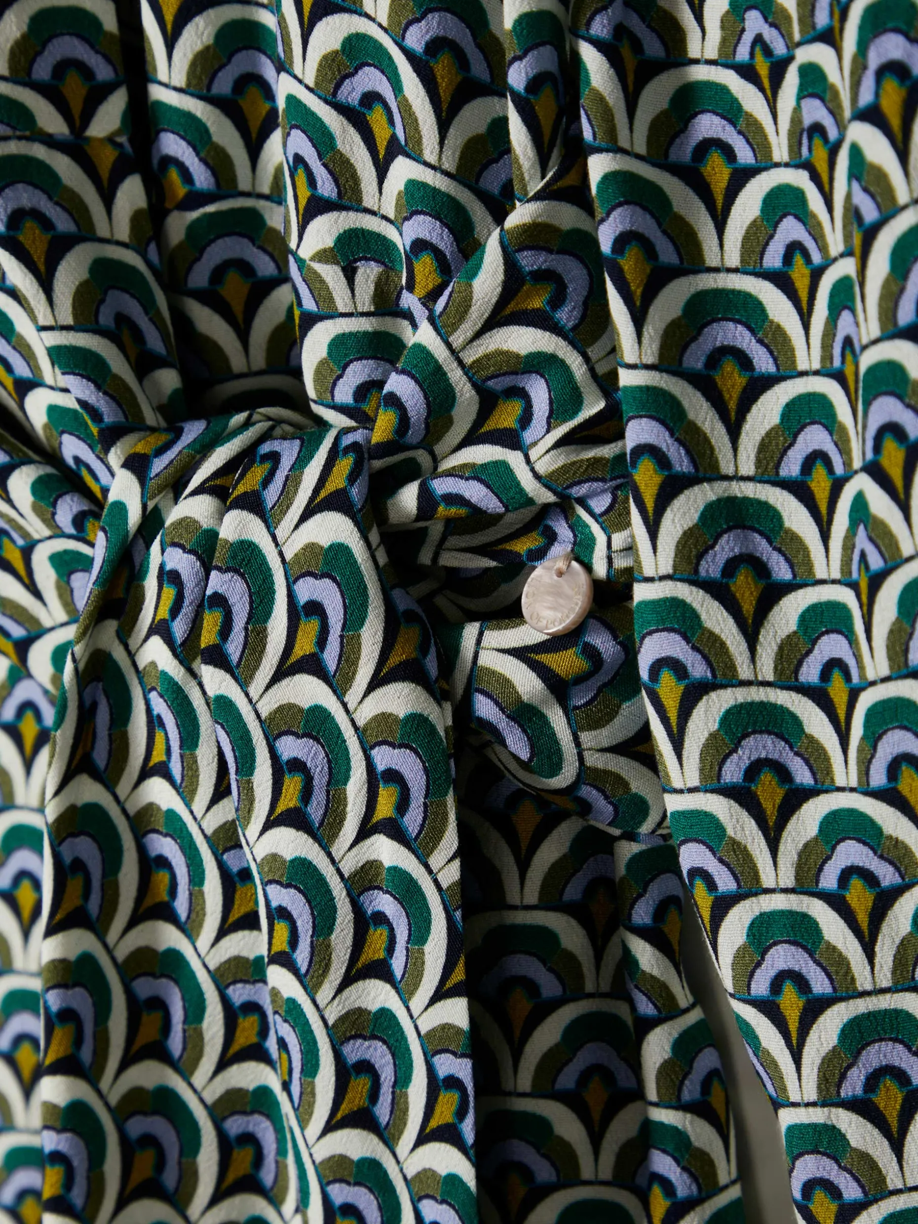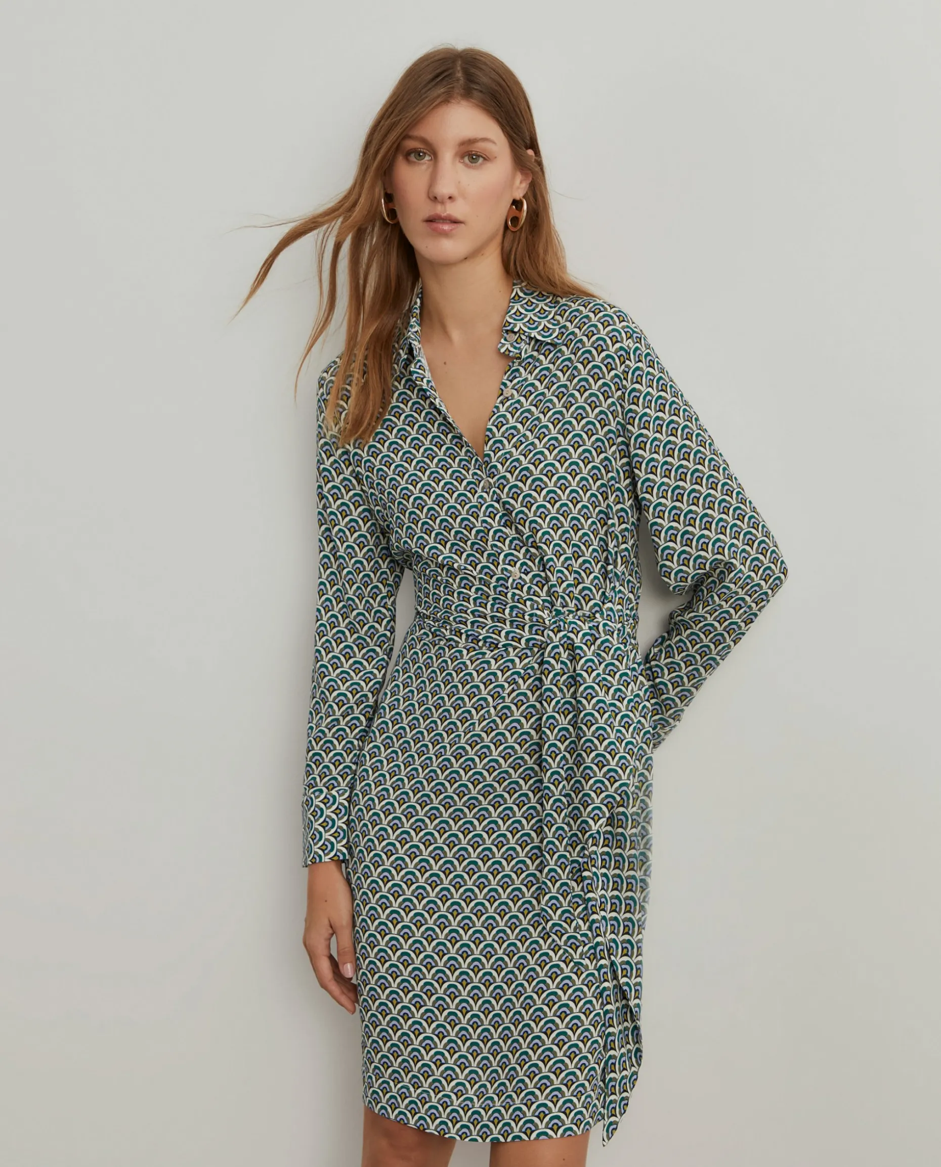 Marque o seu estilo com este vestido camiseiro curto com laçada à frente. Tecido com padrão geométrico. Punhos compridos a apertar com dois botões.