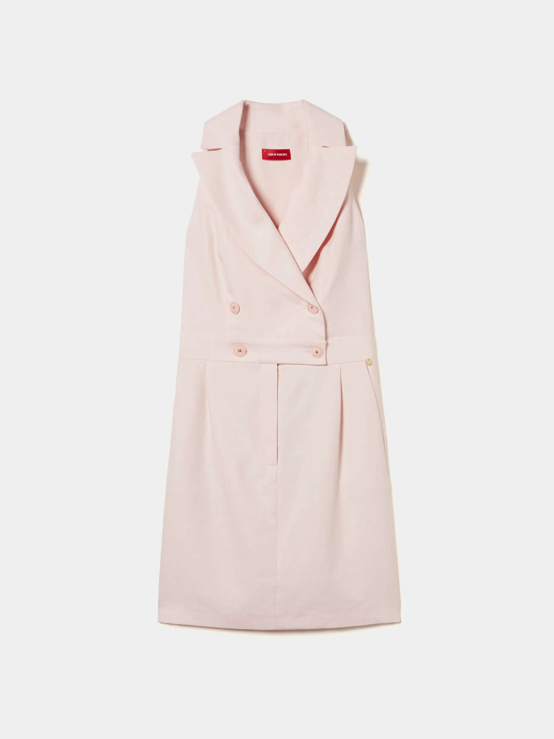 Para um look perfeito de verão, propomos este vestido cintado, sem mangas, com peito em trespasse. A gola é tipo lapela, de blazer, e aperta com botões no trespasse. Para um look completo, veja também o blazer da mesma coleção.