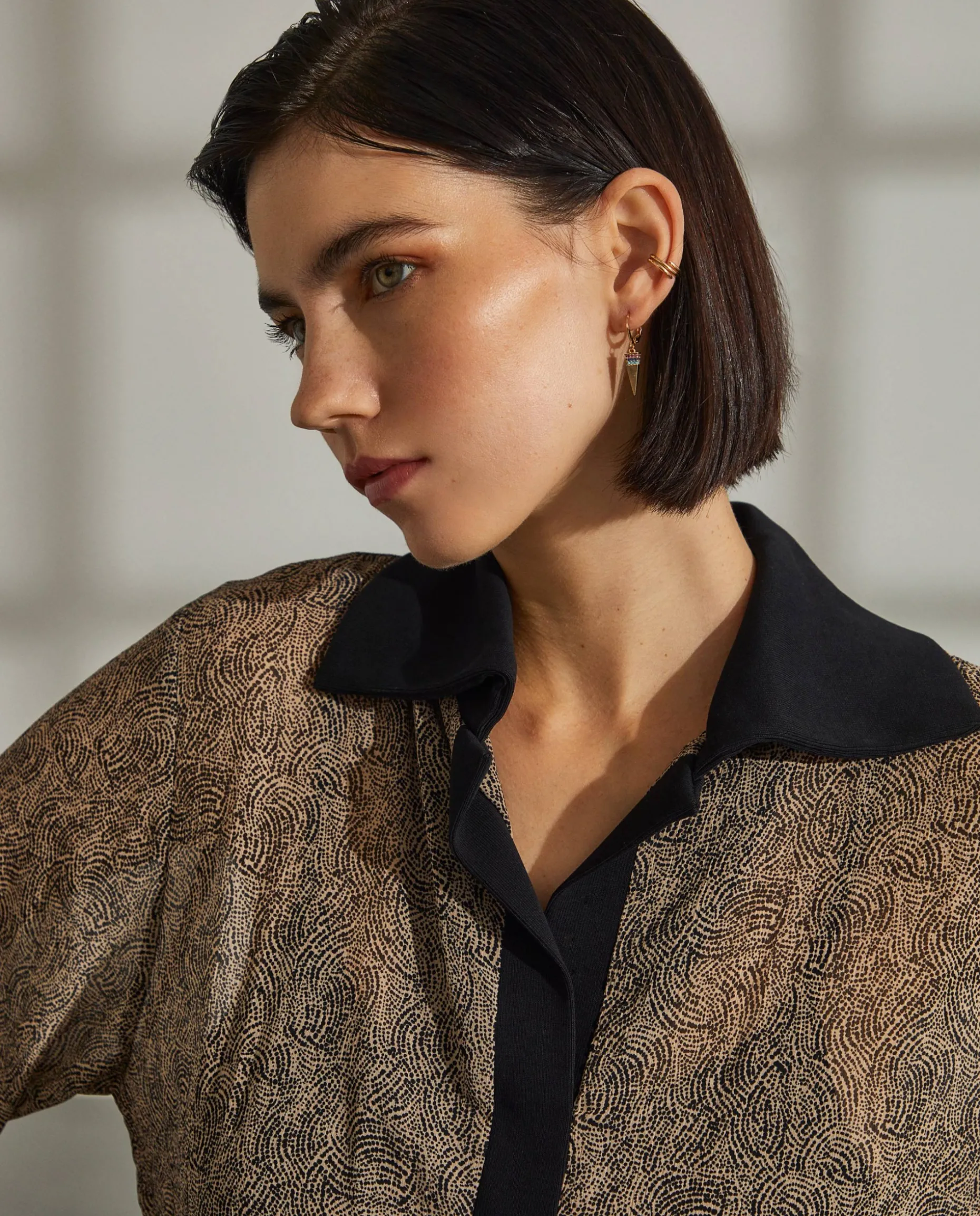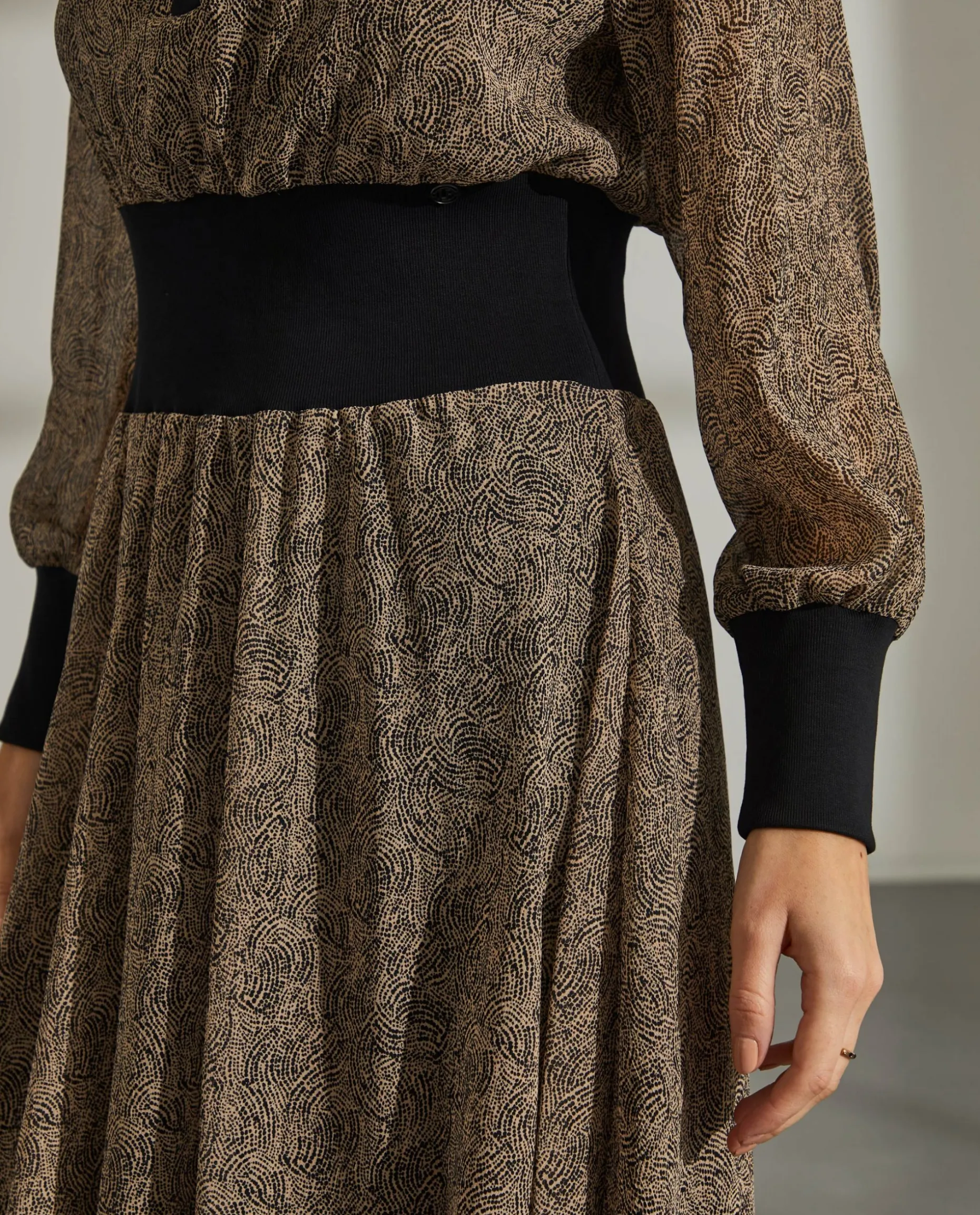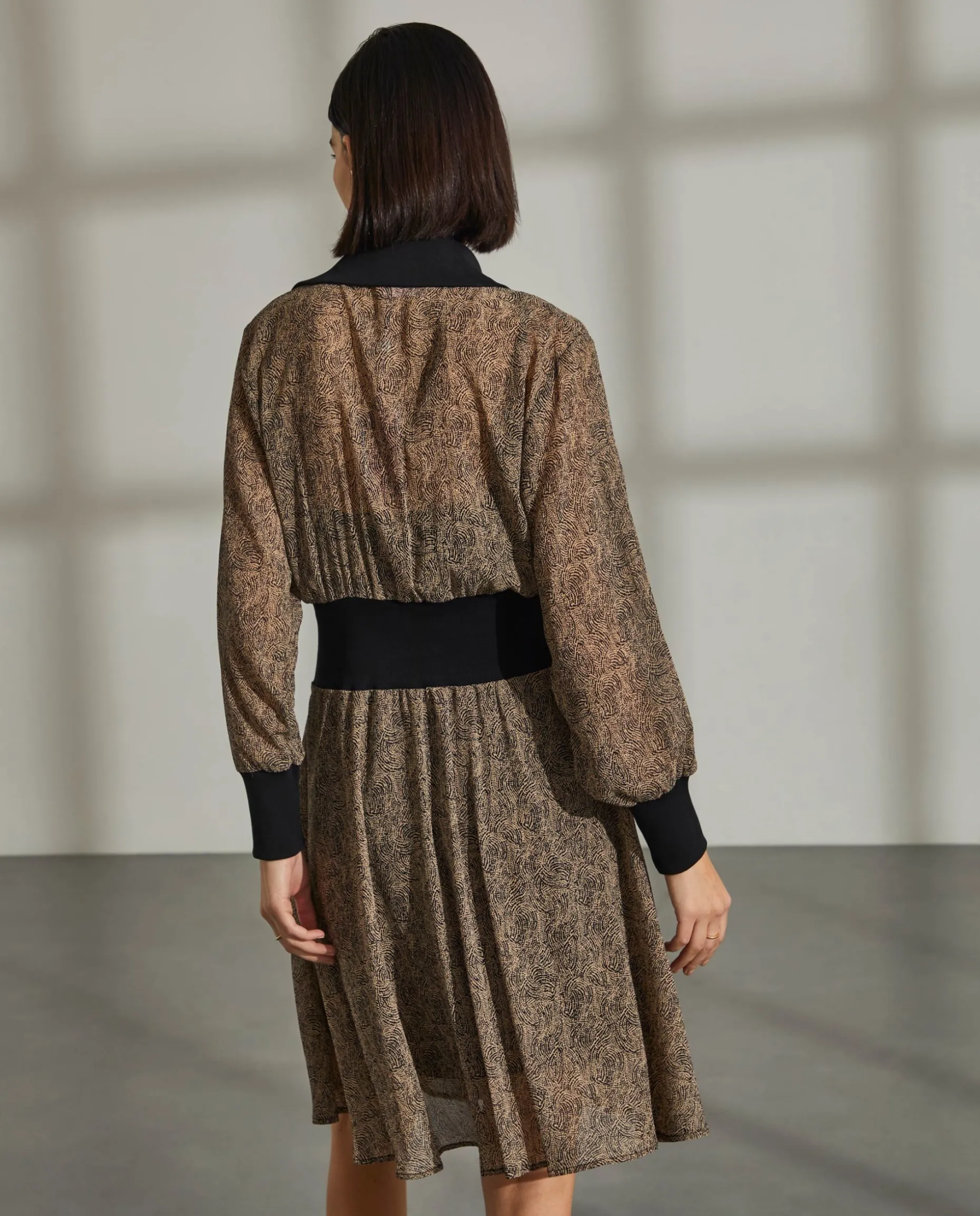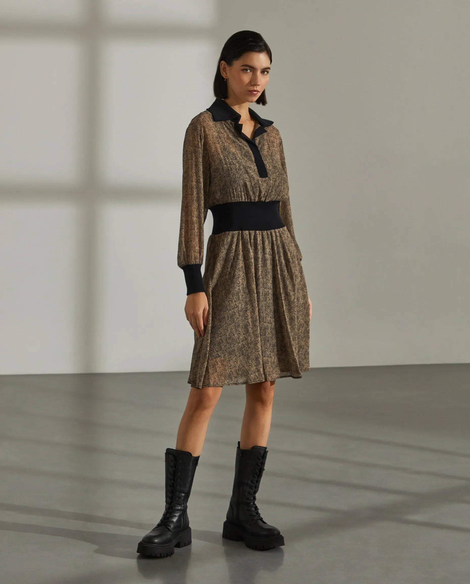 Vestido curto estampado confecionado em tecido com poliester reciclado. Punhos, carcela, gola e cintura confecionados em malha em contraste. Forro interior amovível.