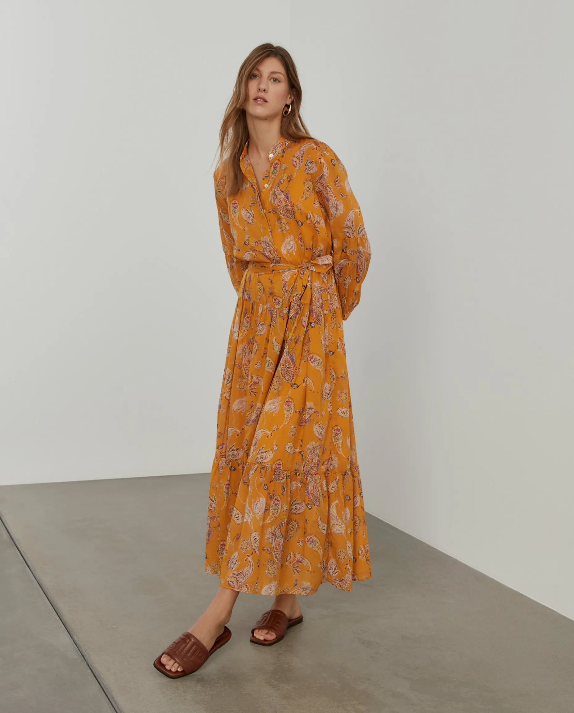 Vestido linha A, maxi. Estampado de cornucópias. Gola mao. Abotoamento oculto por carcela. Manga comprida com franzido na linha do cotovelo através de corte e no punho. Presilhas e cinto no mesmo tecido a ajustar a cintura. Painéis horizontais com franzido. Combinação interior ao tom.