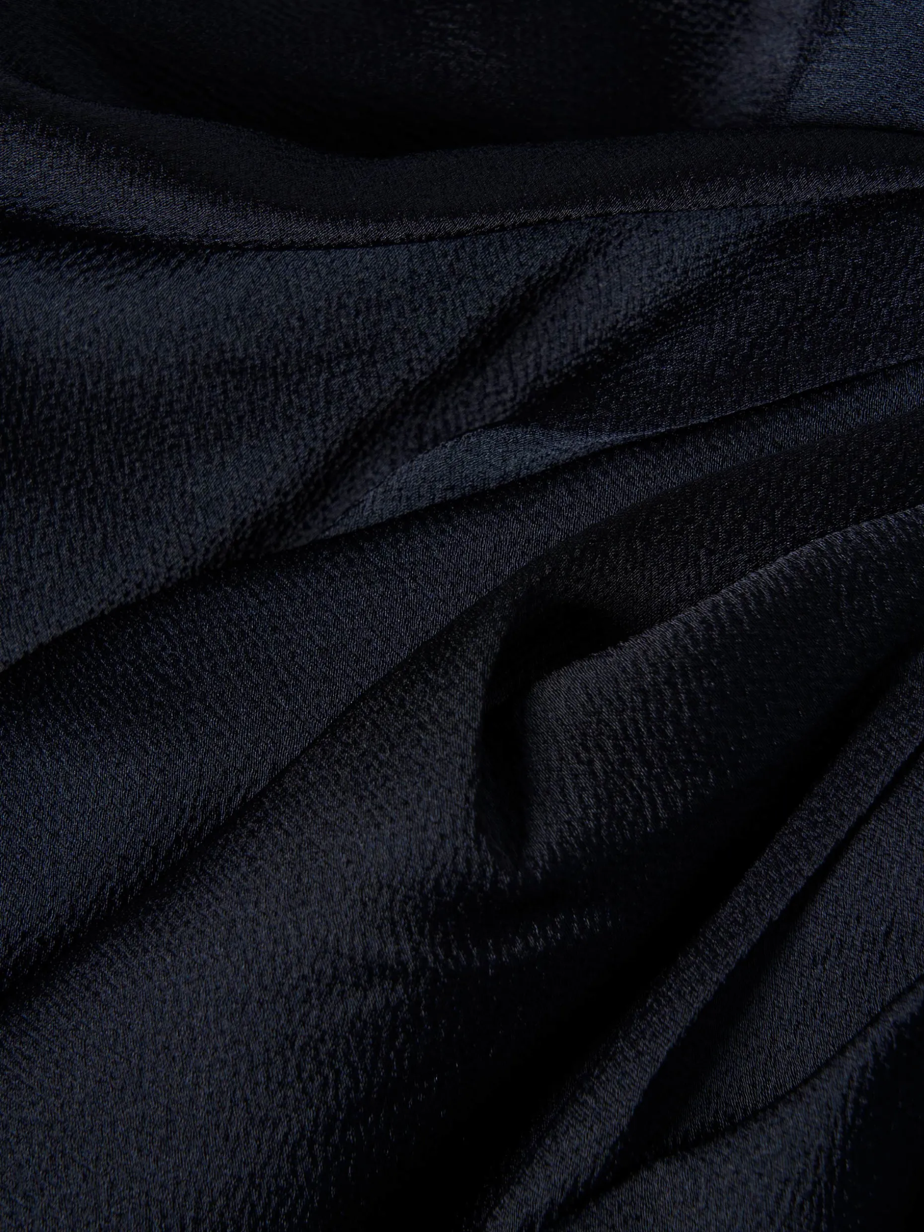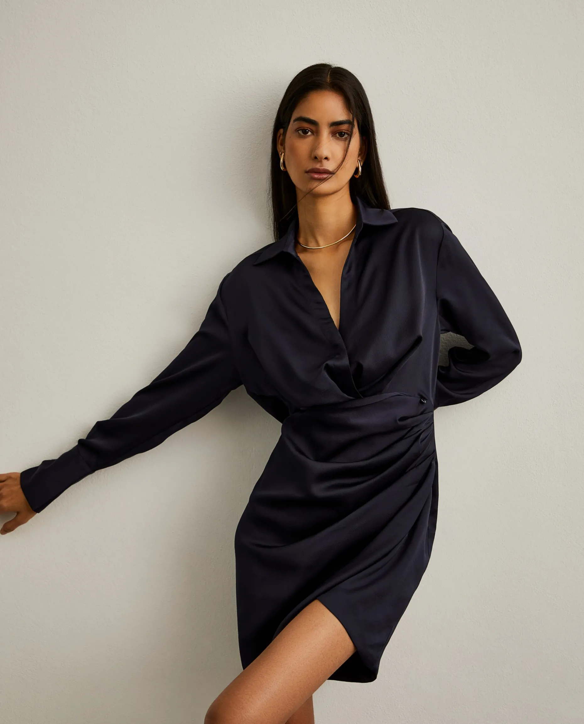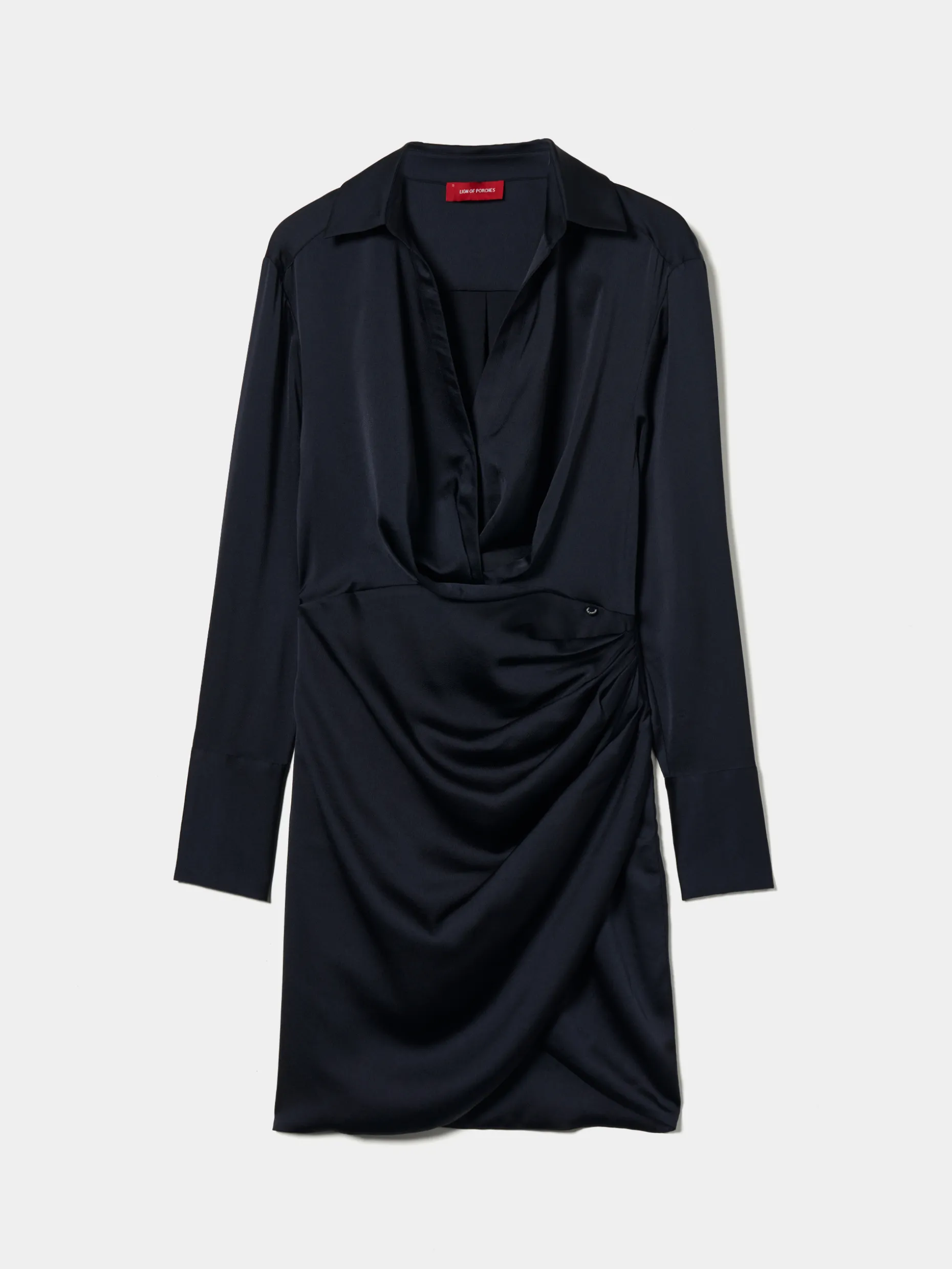 Vestido curto com decote em V. De manga comprida, tem o decote e a saia drapeados, conferindo à peça um toque mais elegante e sofisticado. A base é assimétrica.