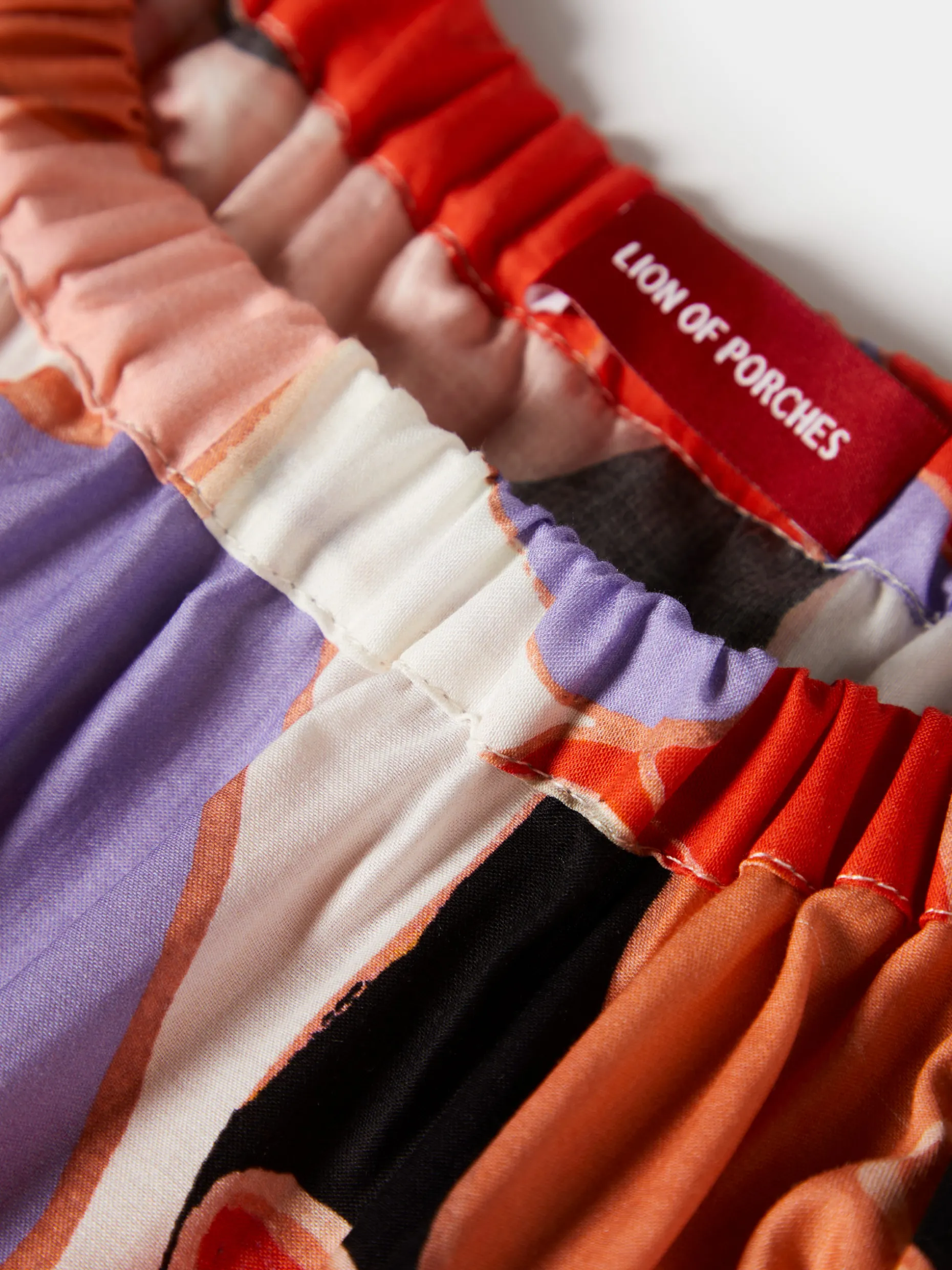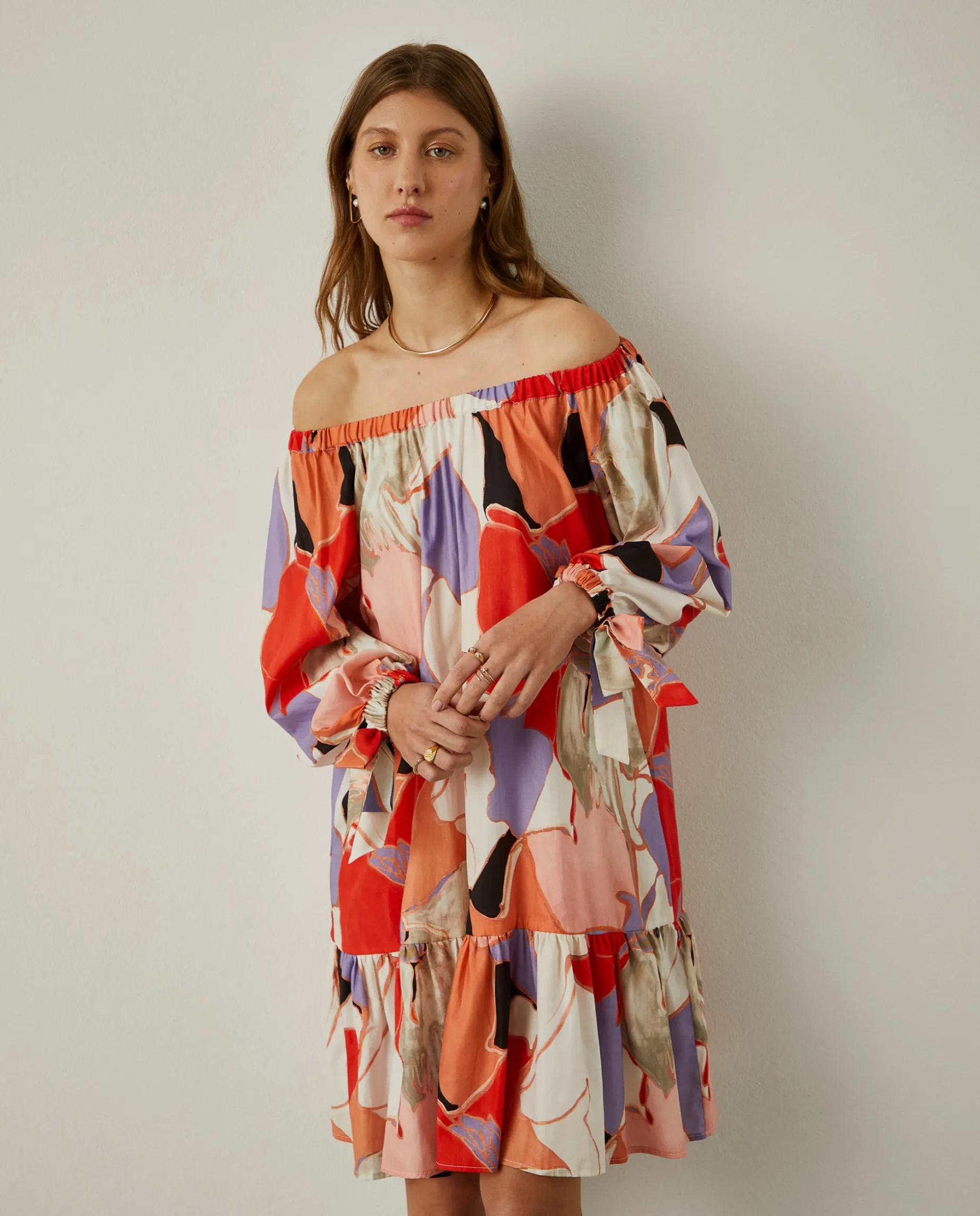 Vestido curto, de fit largo, com padrão abstrato colorido. Tem decote em barco franzido e elástico, assim como as mangas 3/4 que, além de elásticas, finalizam também com laços nos punhos. A base do vestido tem folho na bainha para um cair mais elegante.