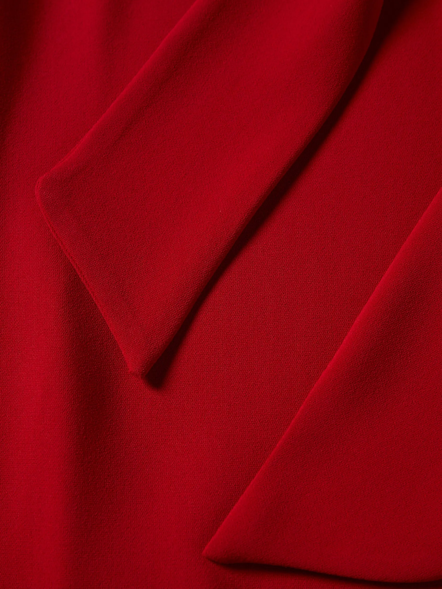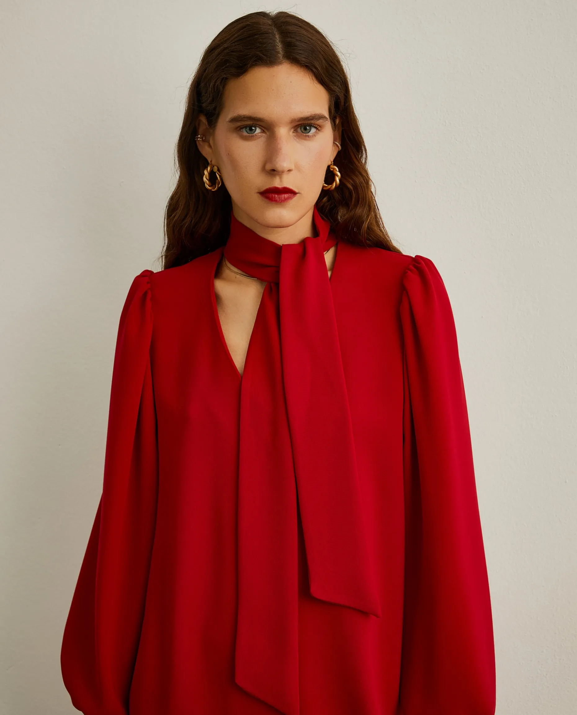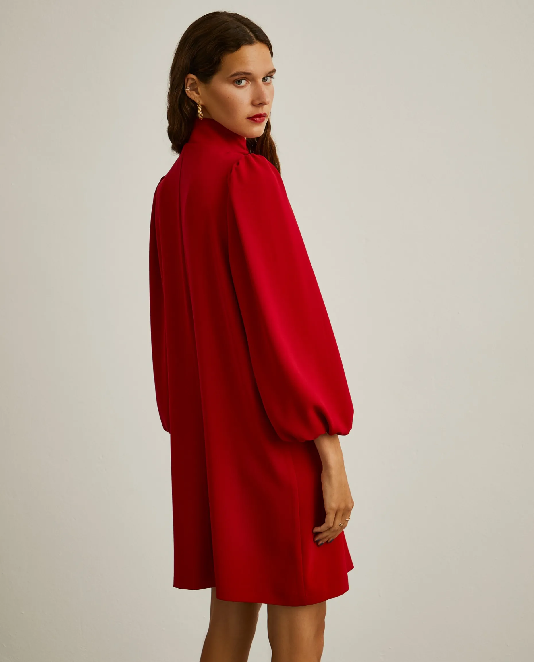 Revele toda a sua elegância com este vestido curto com decote em V e laçada no pescoço para um toque diferenciador. As mangas são abaloadas com franzido nos ombros e nos punhos.