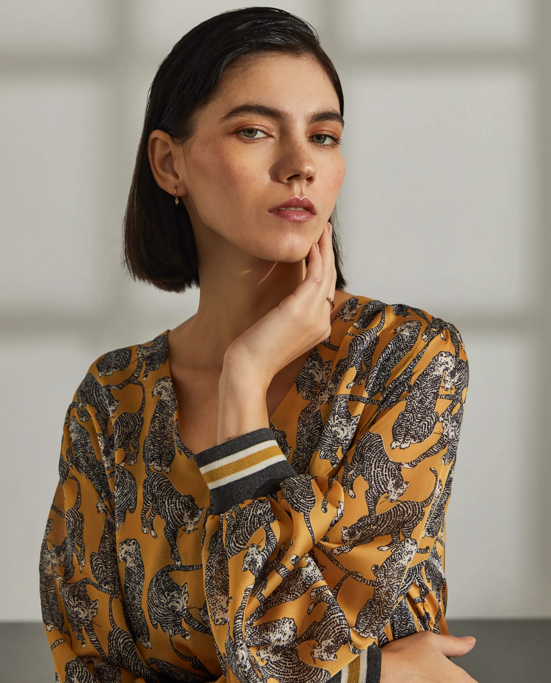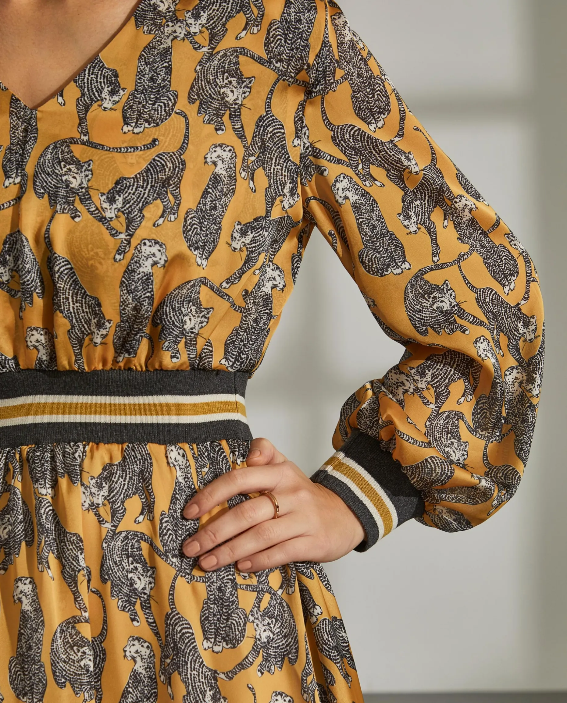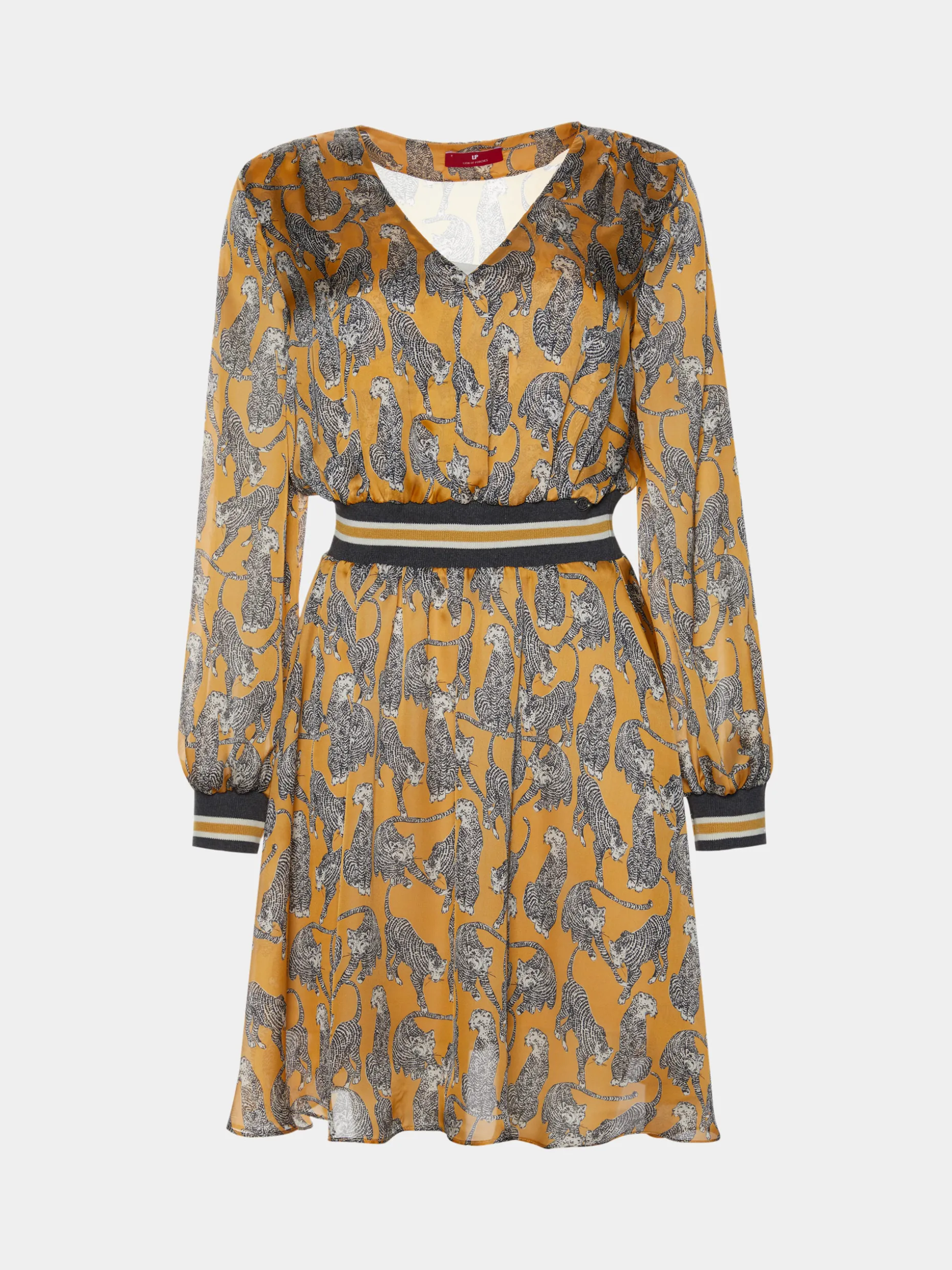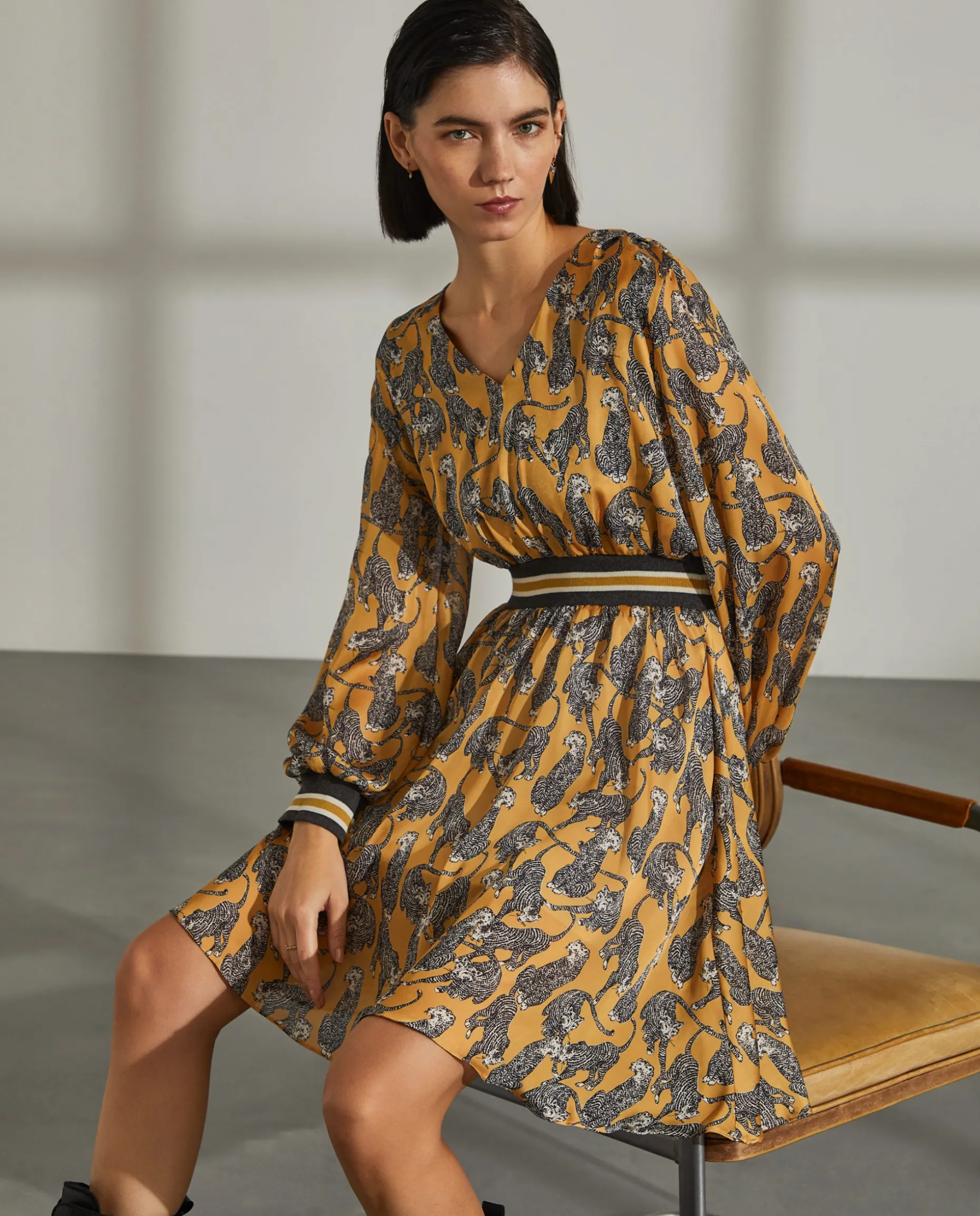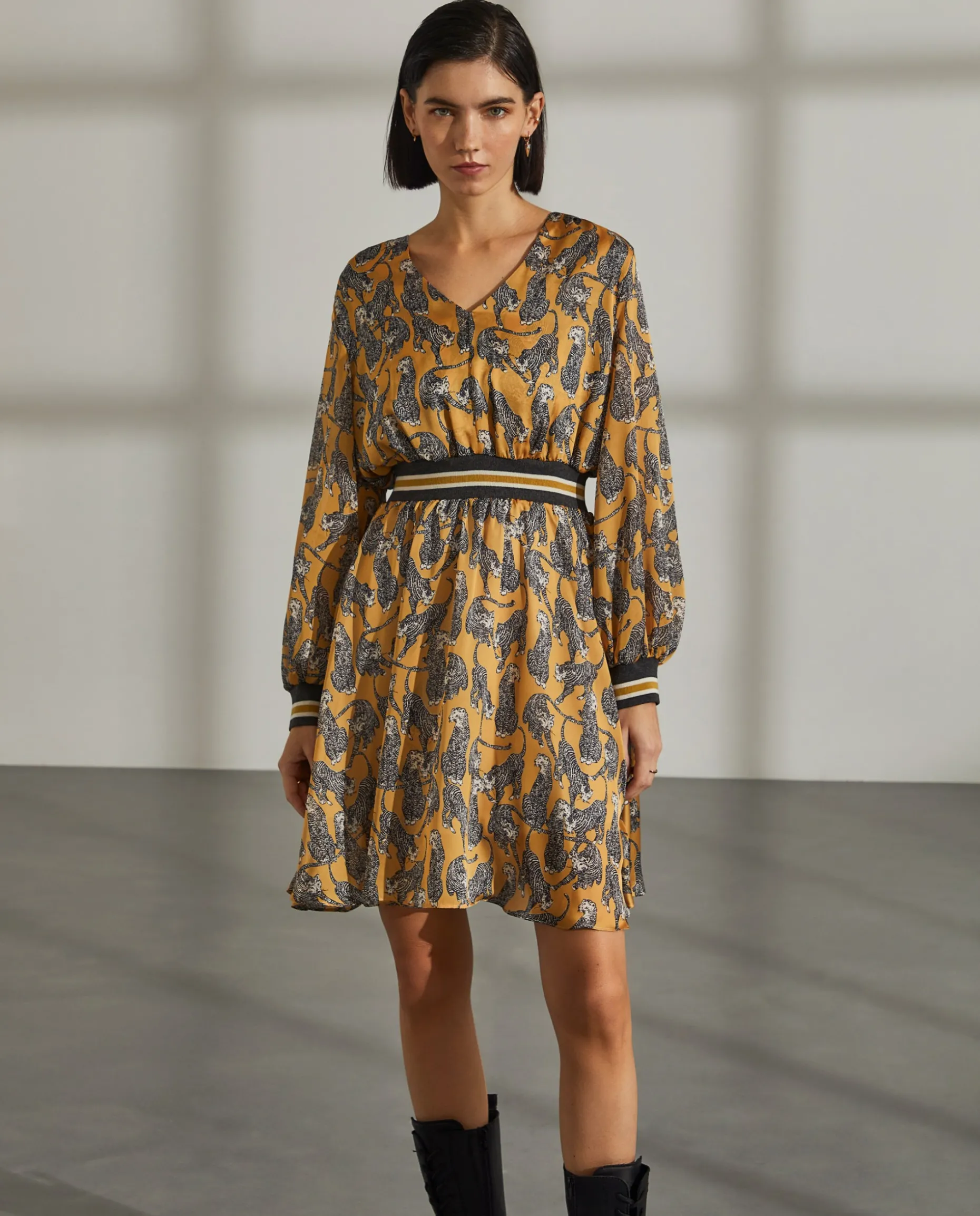 Vestido curto estampado com padrão animal confecionado com poliester reciclado. Decote em V. Punhos e cintura com malha de riscas. Forro interior.