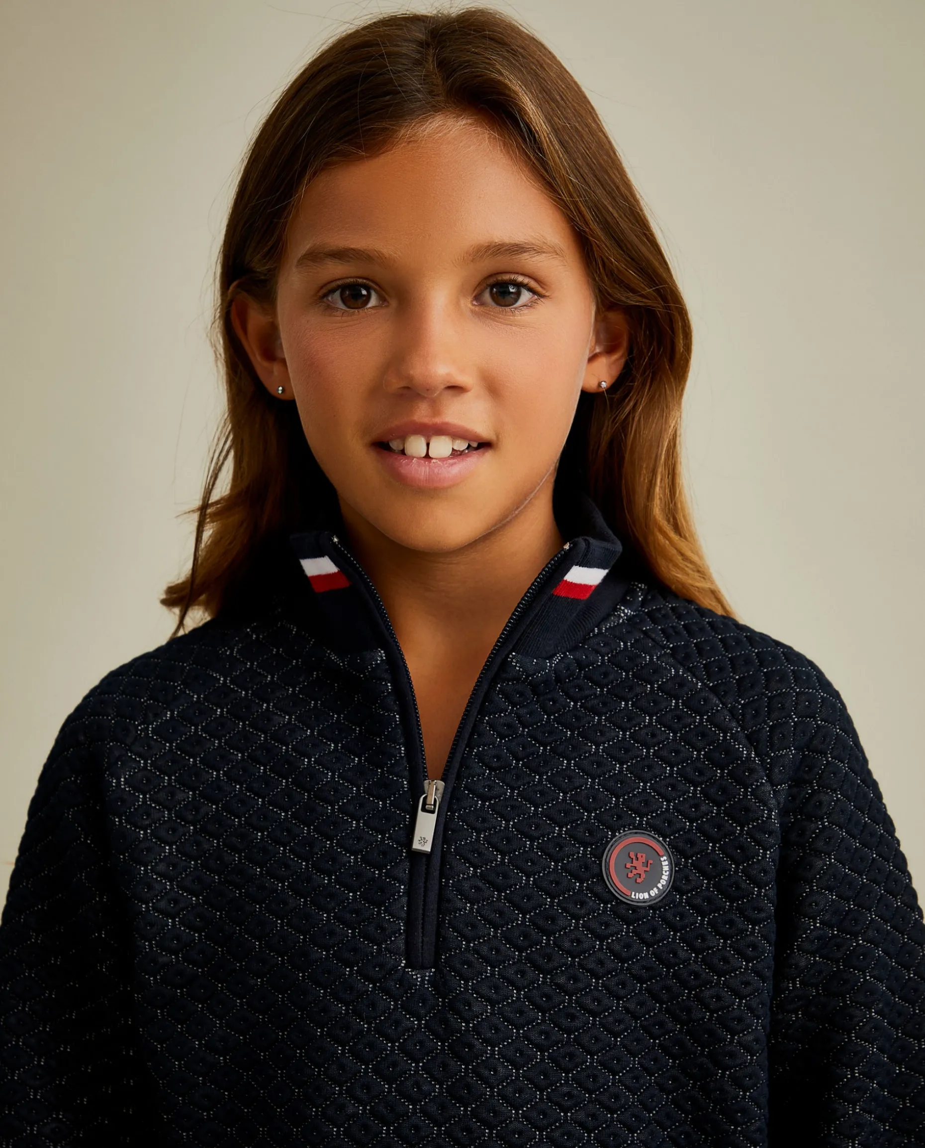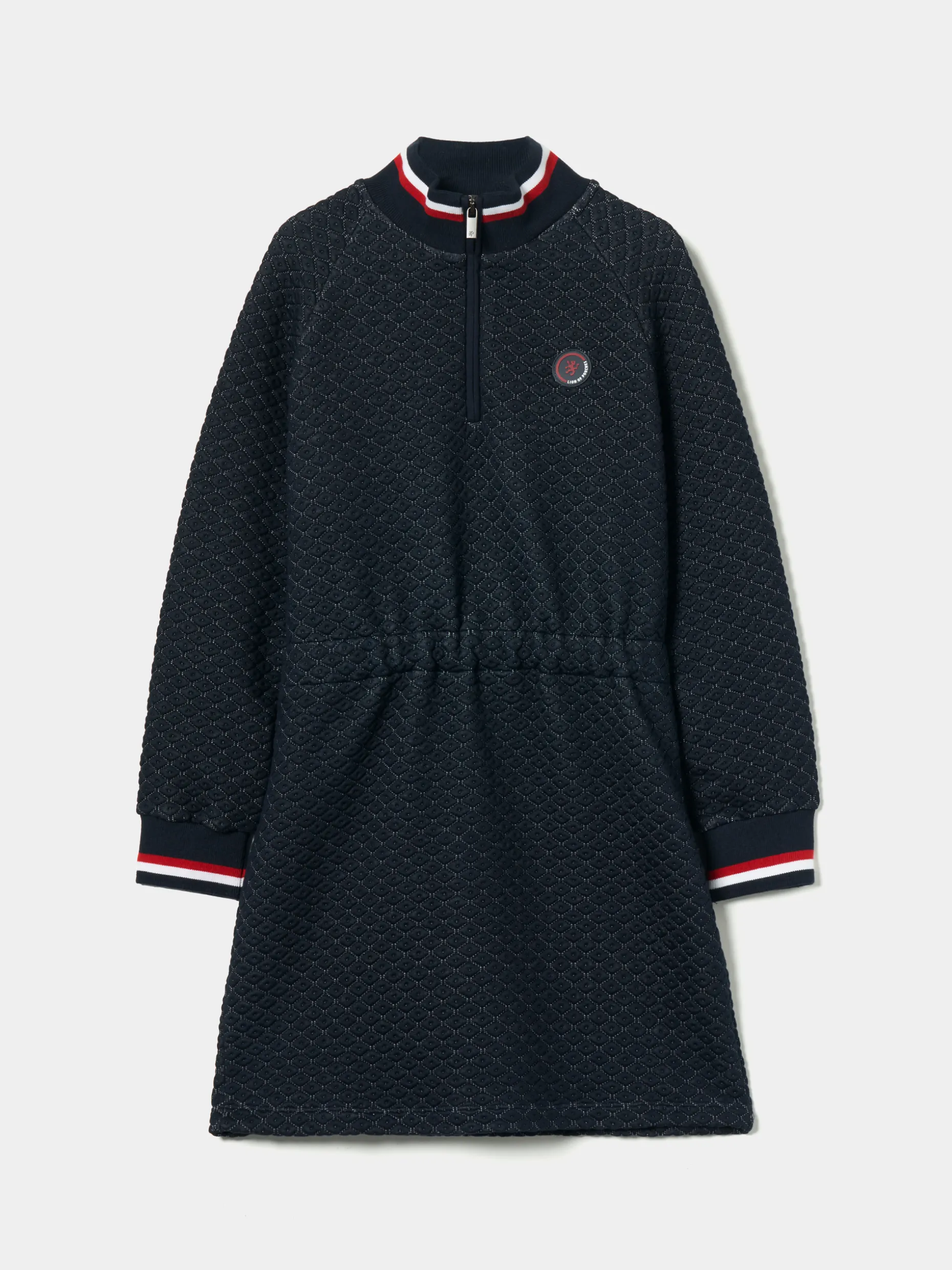 Vestido em malha fantasia com manga comprida. Tem fecho de correr no pescoço e a gola ligeiramente subida. Pormenor de riscas tricolor no pescoço e punhos e etiqueta de borracha redonda no peito.