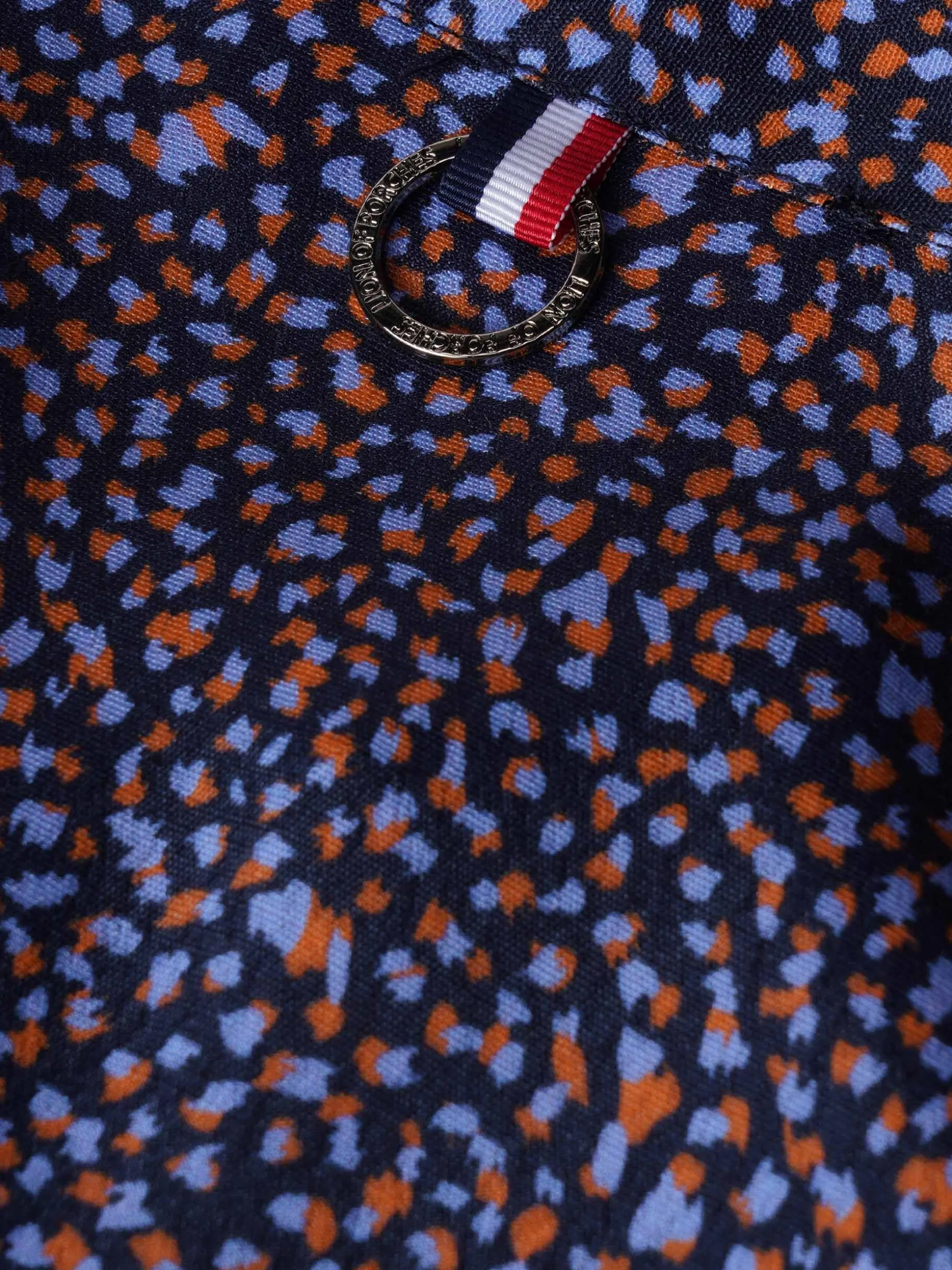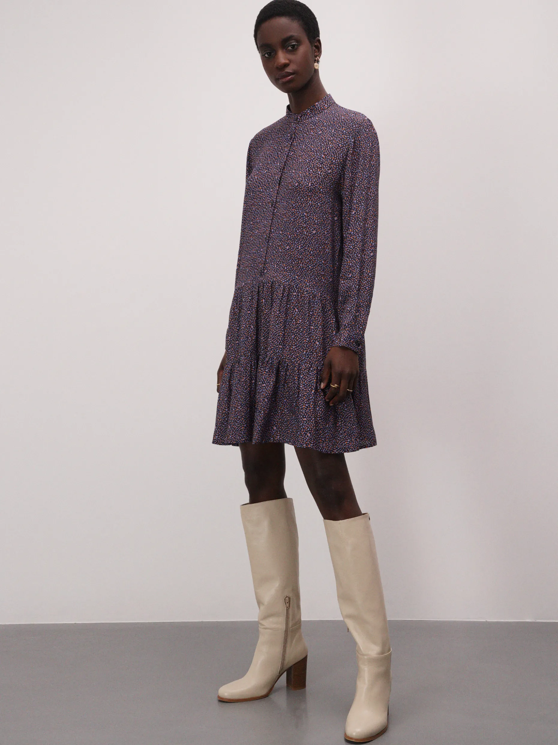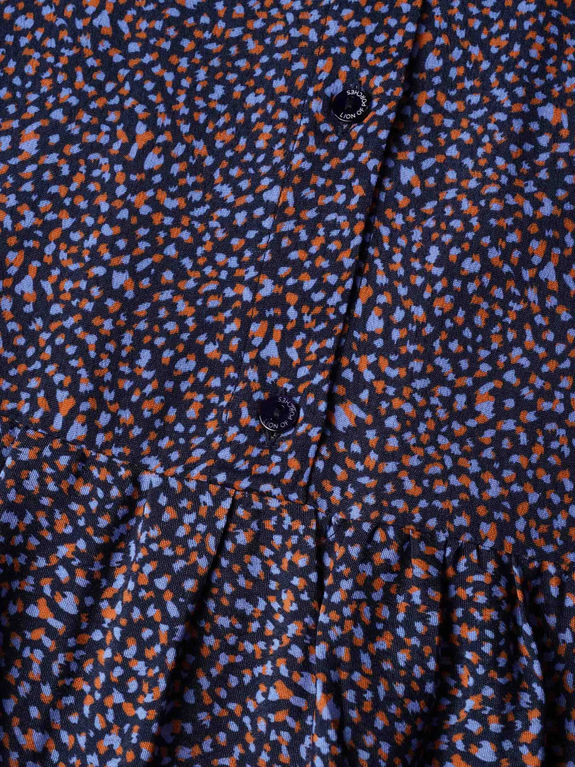 Vestido fluido estampado com folho. Cintura descida. Punhos abotoados. Aperta na frente com botões.