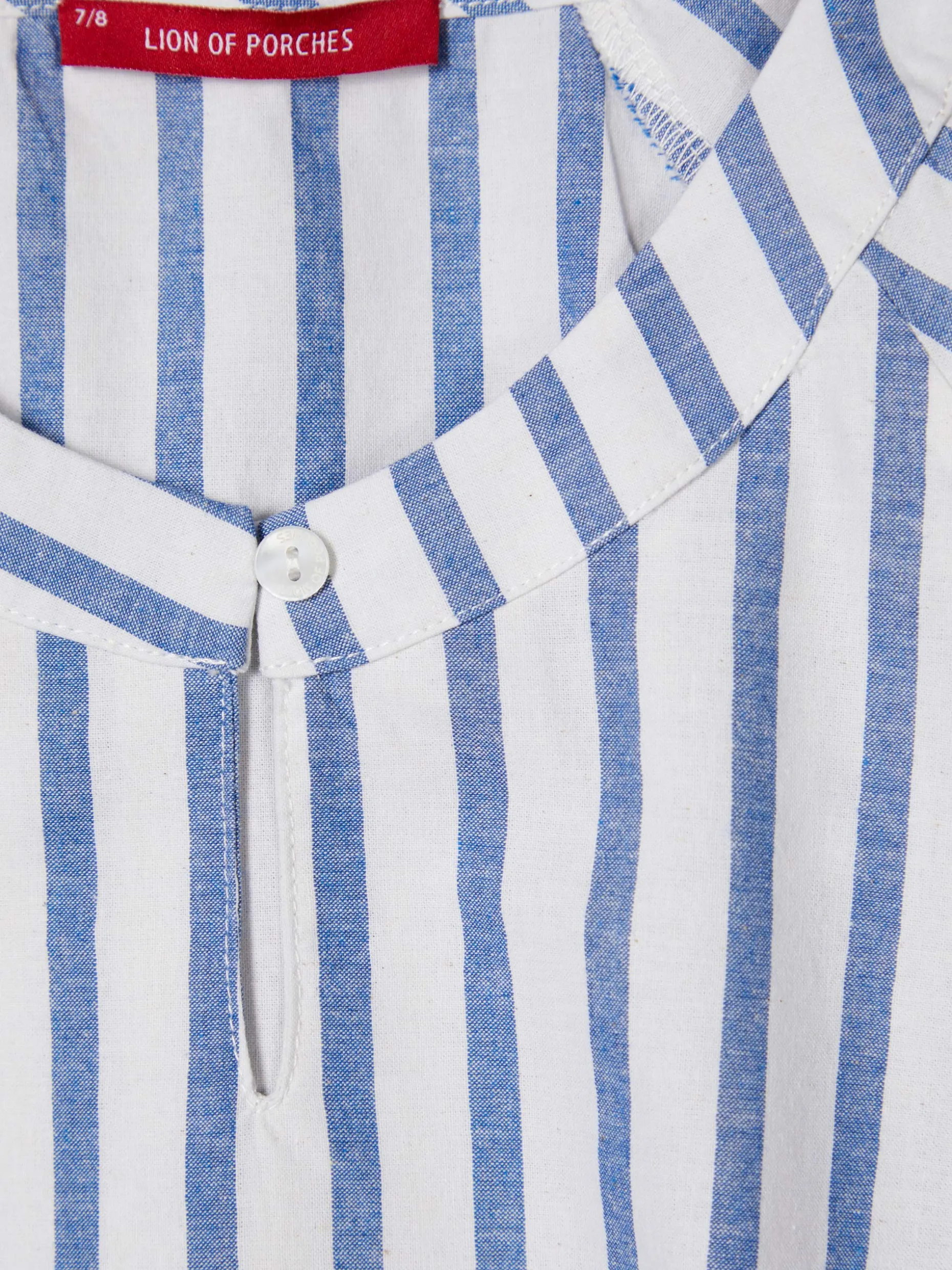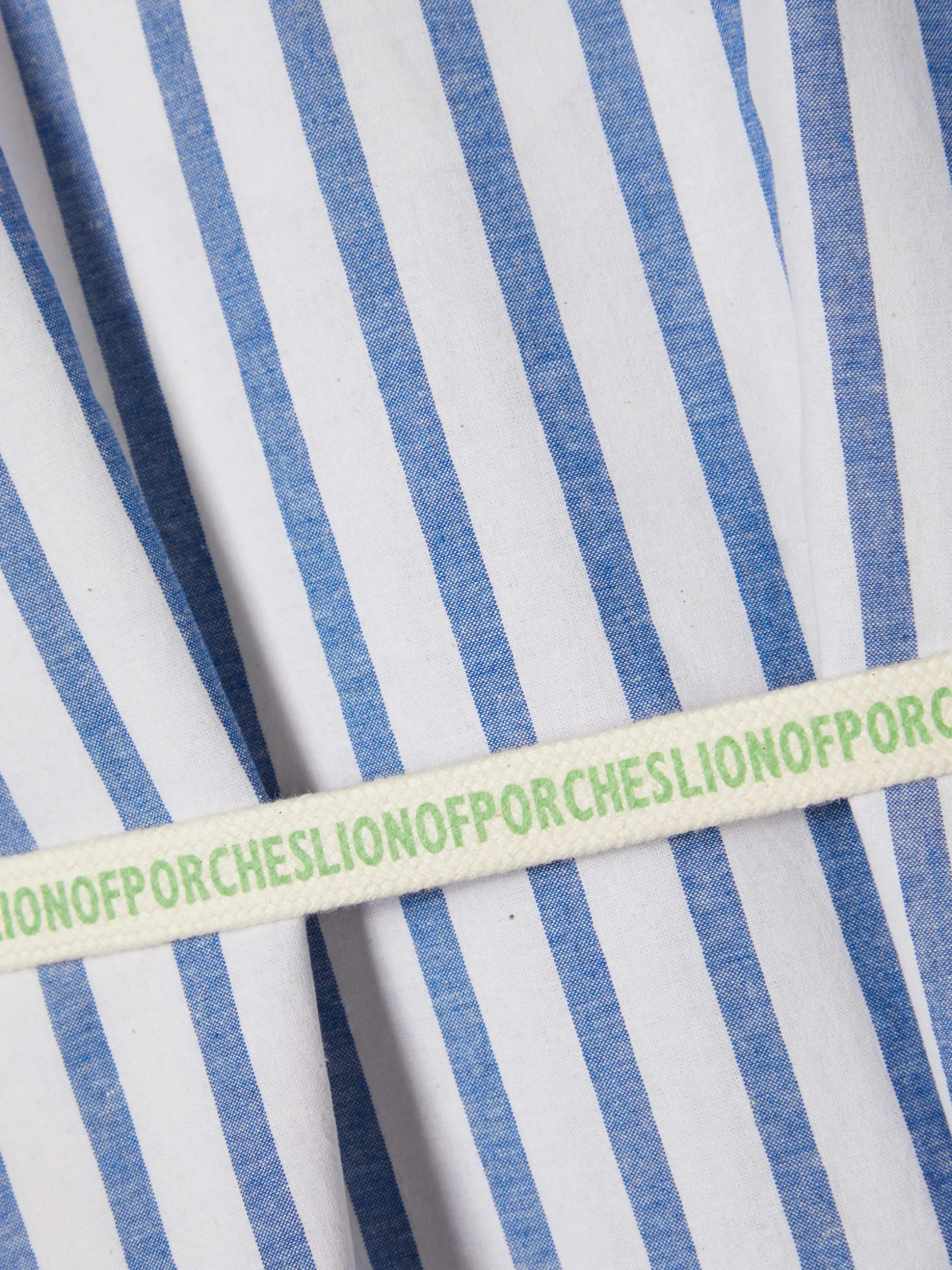 Vestido de manga 3/4 às riscas. Detalhe de cordão na cinta com estampado Lion of Porches em 2 cores. Aperta com botão personalizado na frente e punhos. Saia com folho.