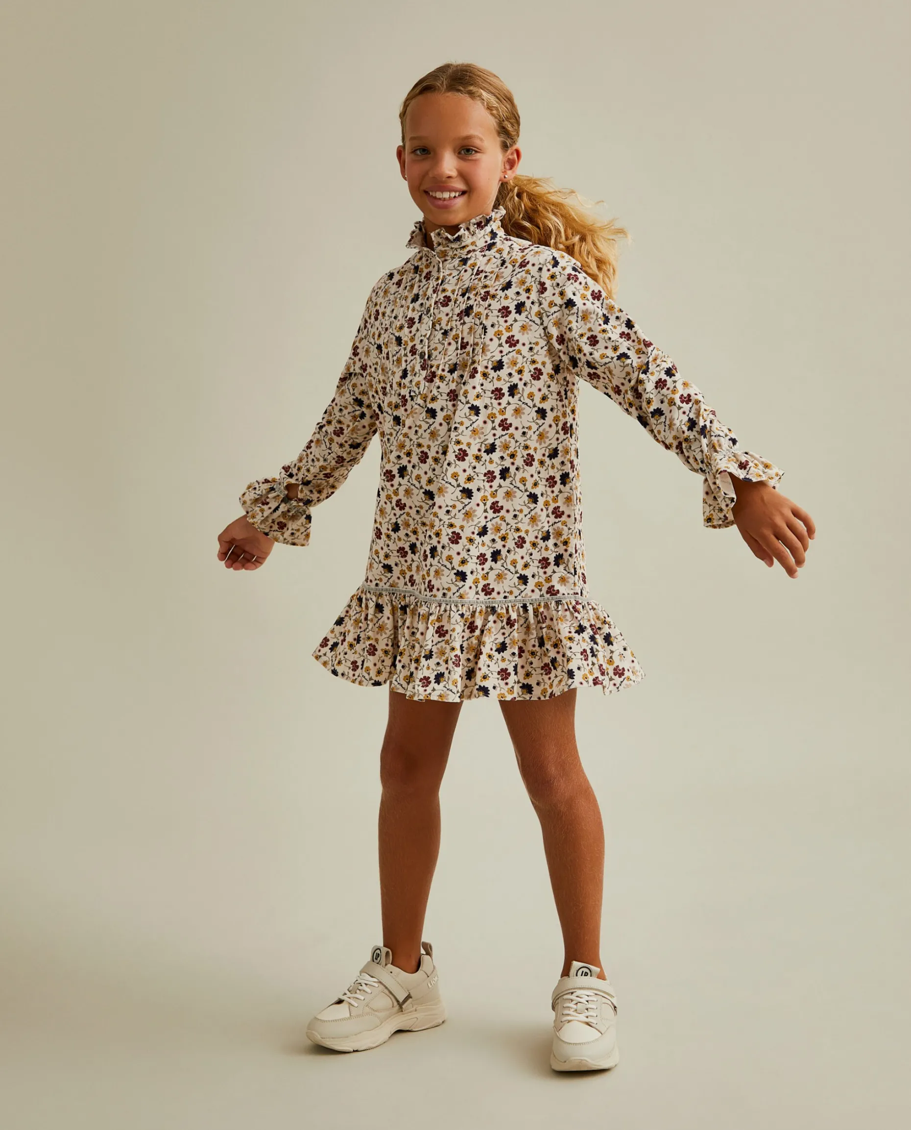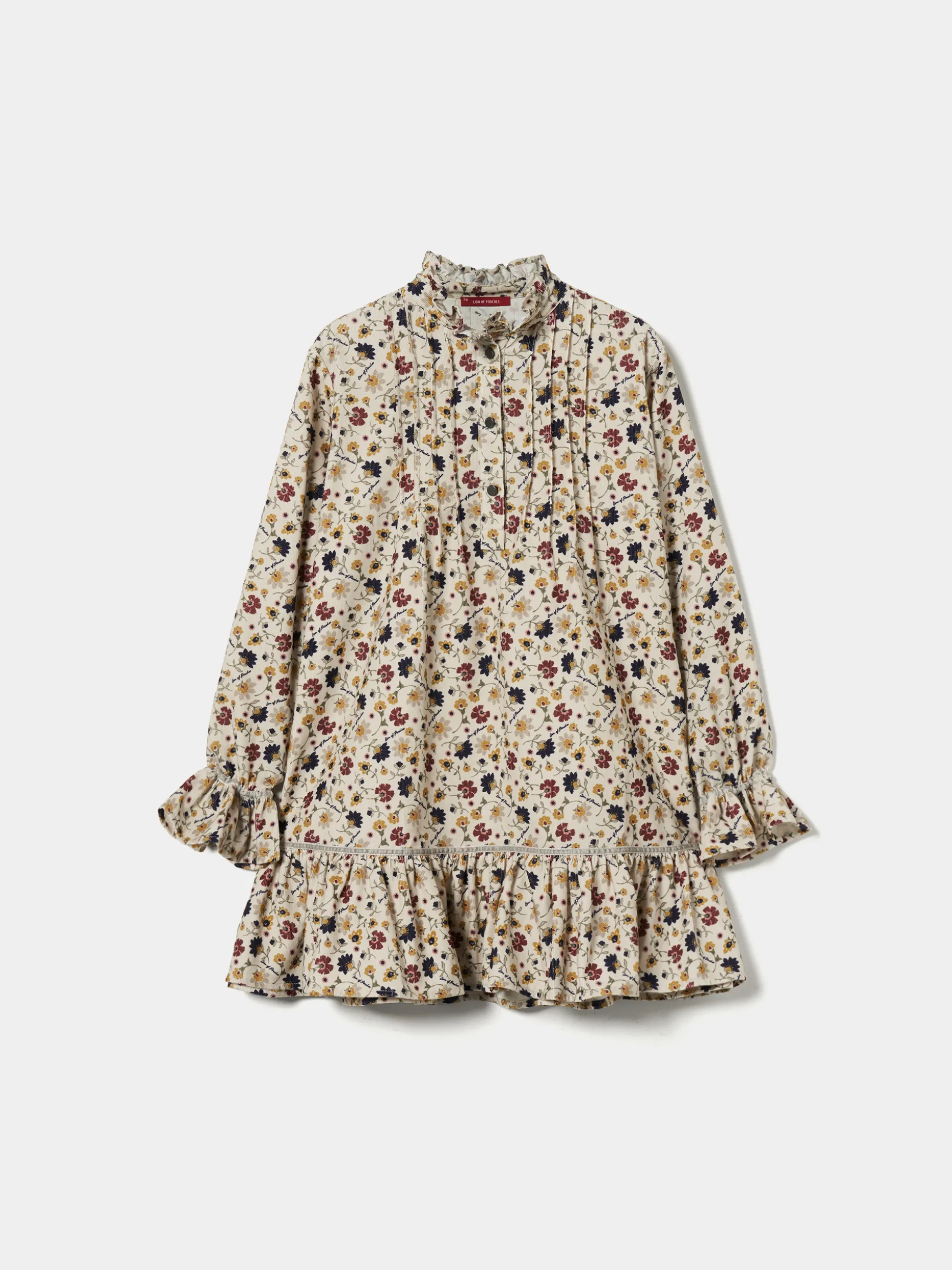Vestido manga comprida em bombazine estampada com botões personalizados na frente. Fita de veludo em contraste no fundo e nos punhos. Placa personalizada nas costas perto da gola.