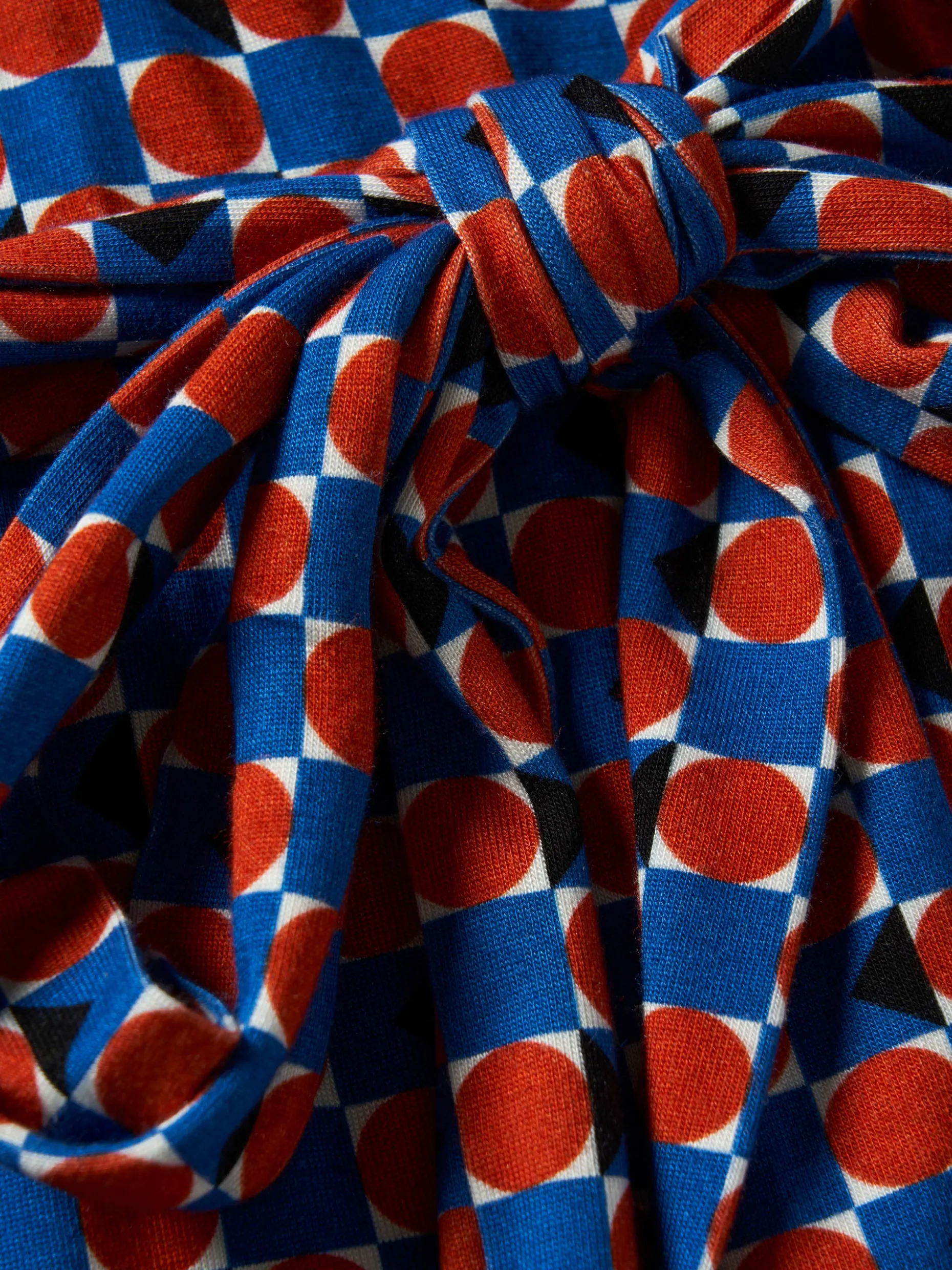 Vestido de malha midi trespassado, com padrão geométrico, para a mulher que gosta de looks coloridos e originais. De decote em V, finaliza com cinto ao tom para ajustar a gosto. A manga é comprida.