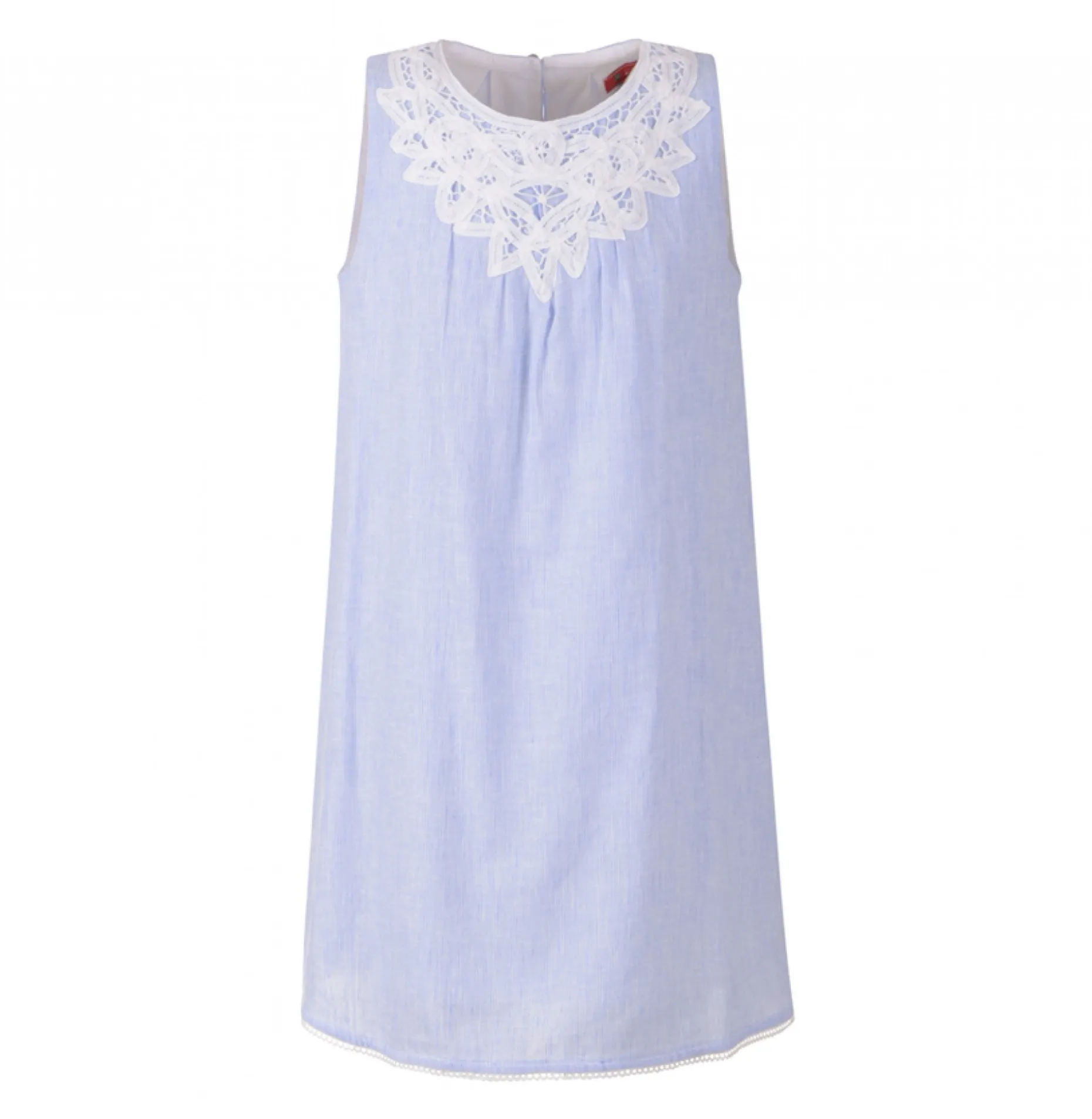 Fresco e simples são as palavras que melhor definem este vestido, em linho com riscas verticais e aplicação de renda ao nível do decote.