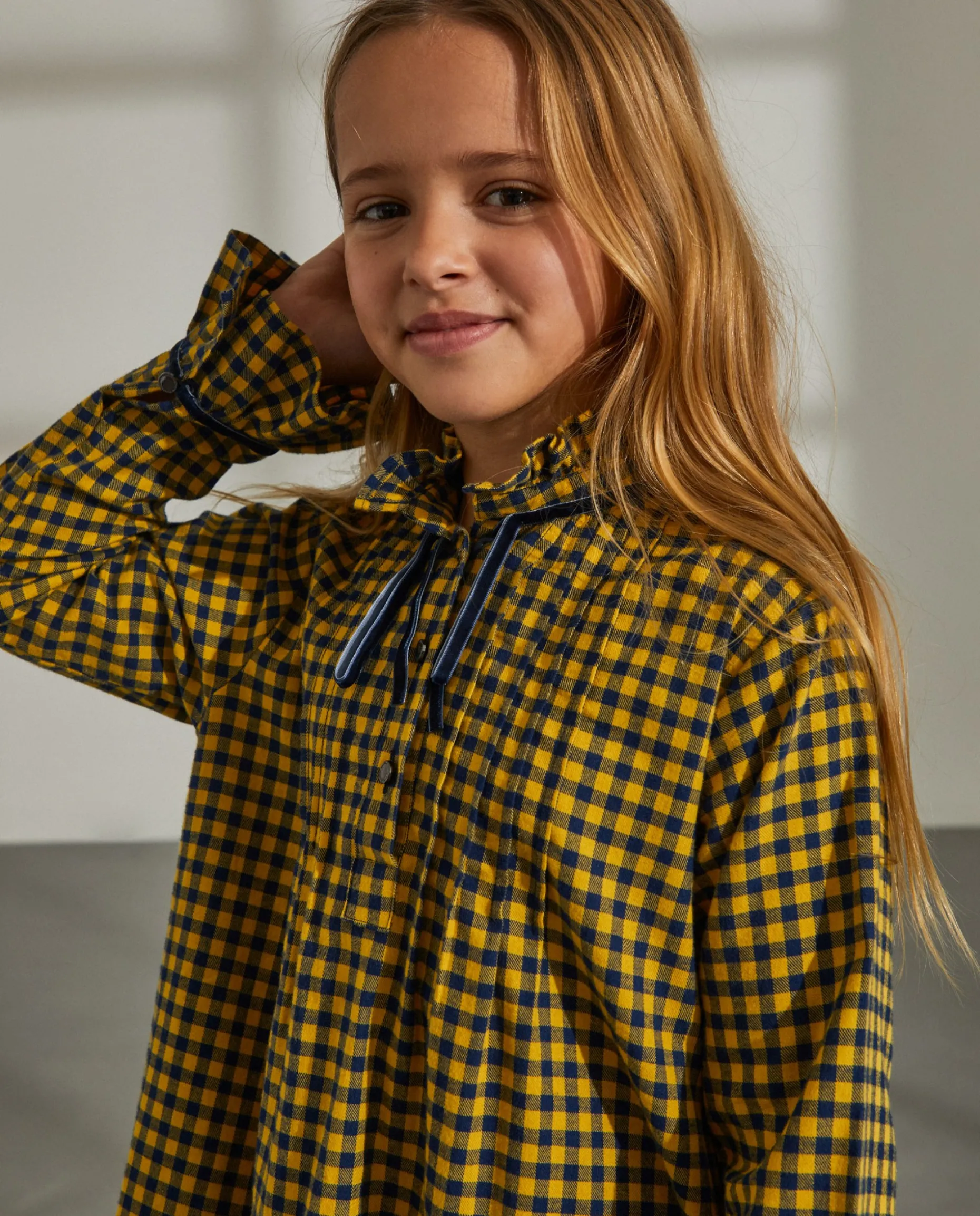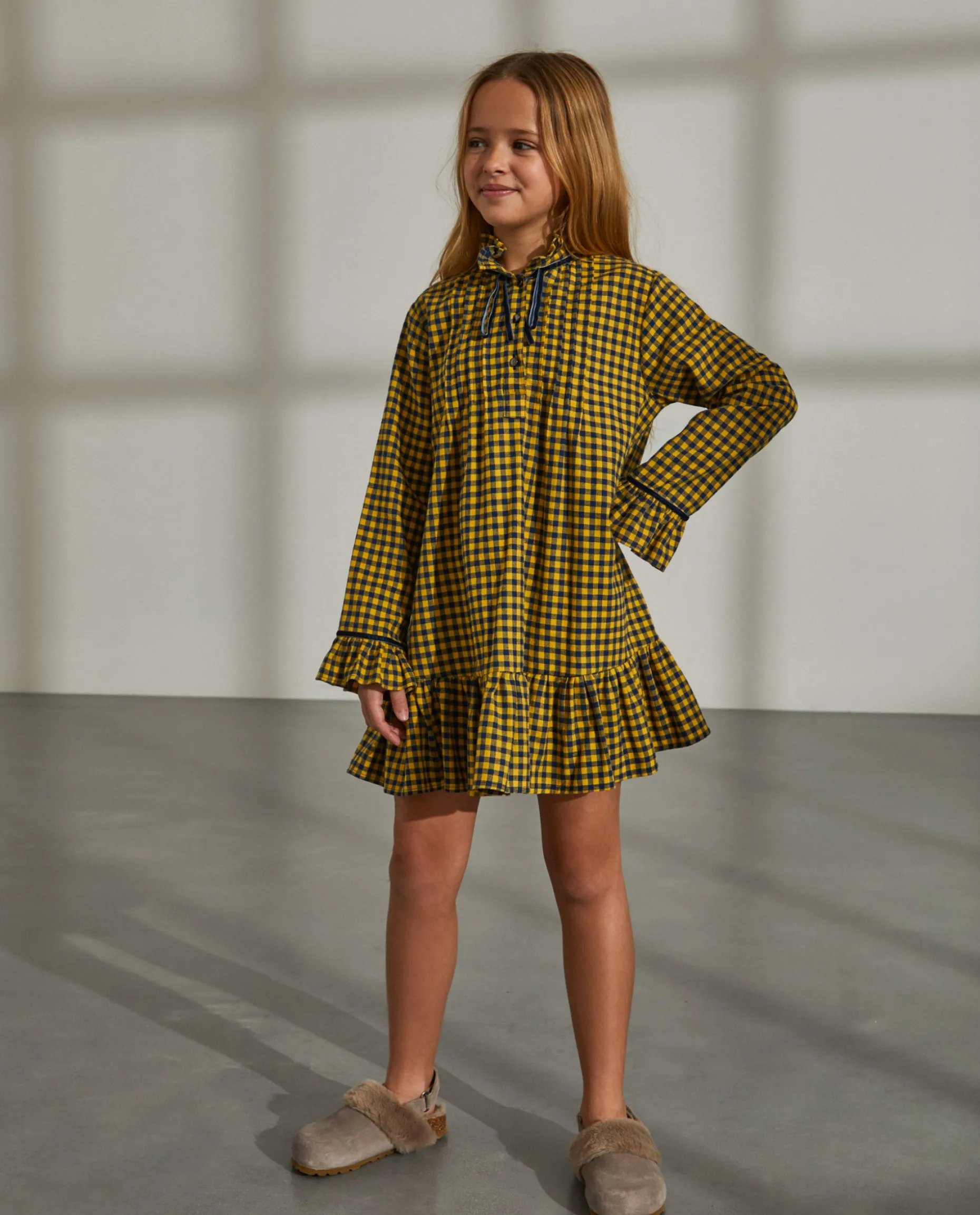Vestido com padrão vichy confecionado em 100% algodão. Folhos na bainha, punhos e gola. Detalhe de fita de veludo nos punhos e gola.