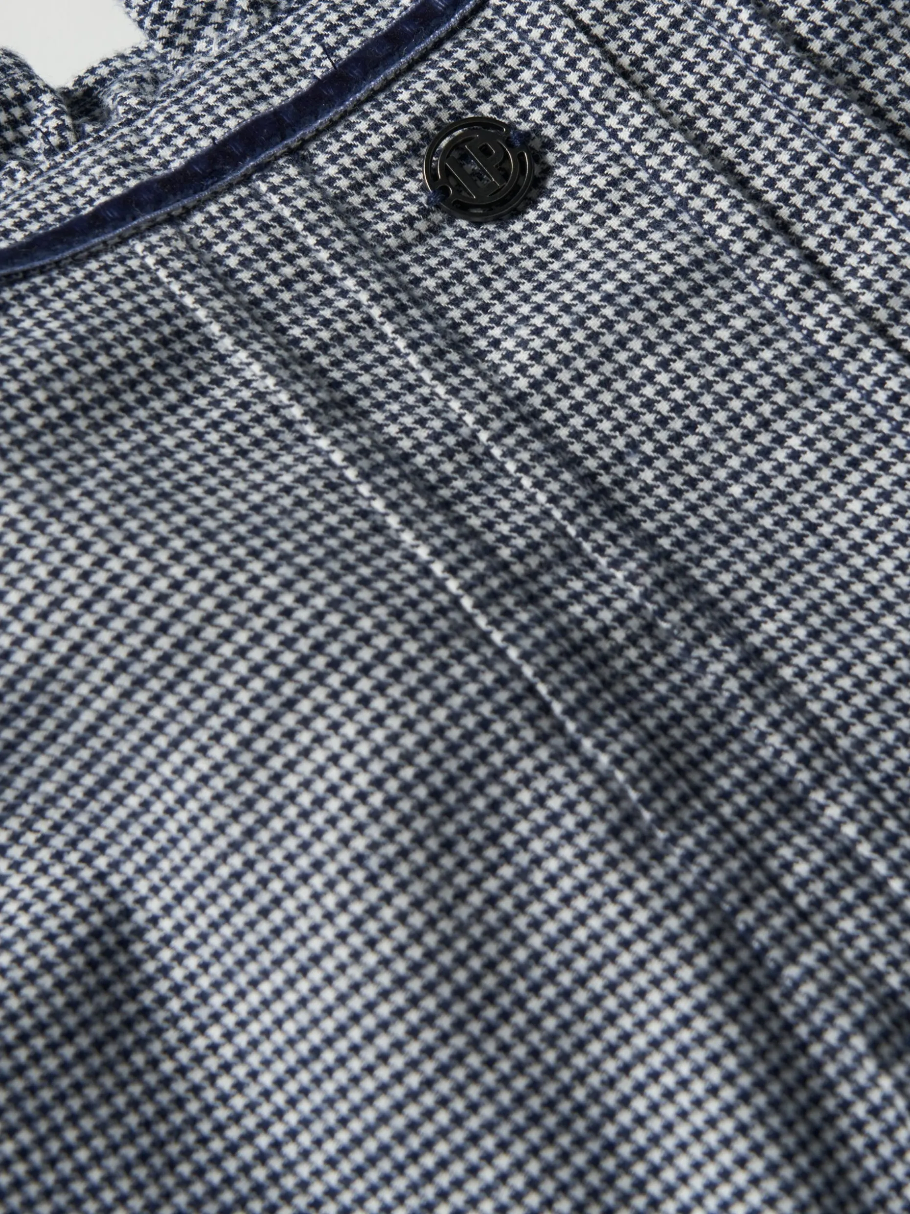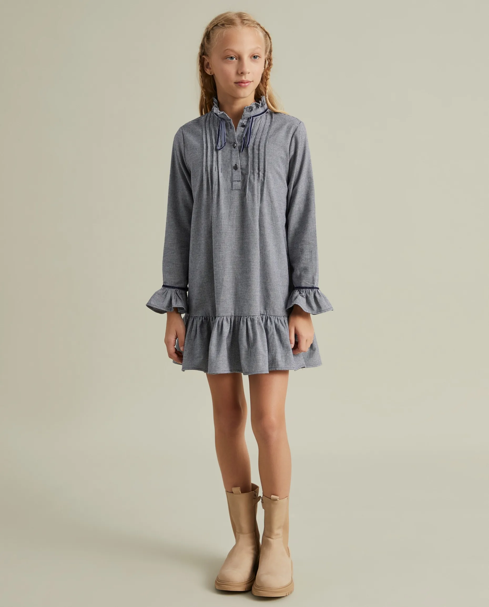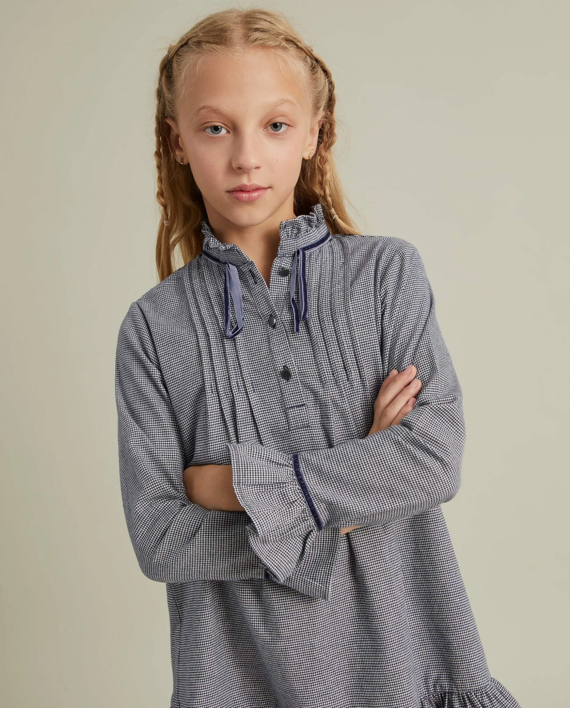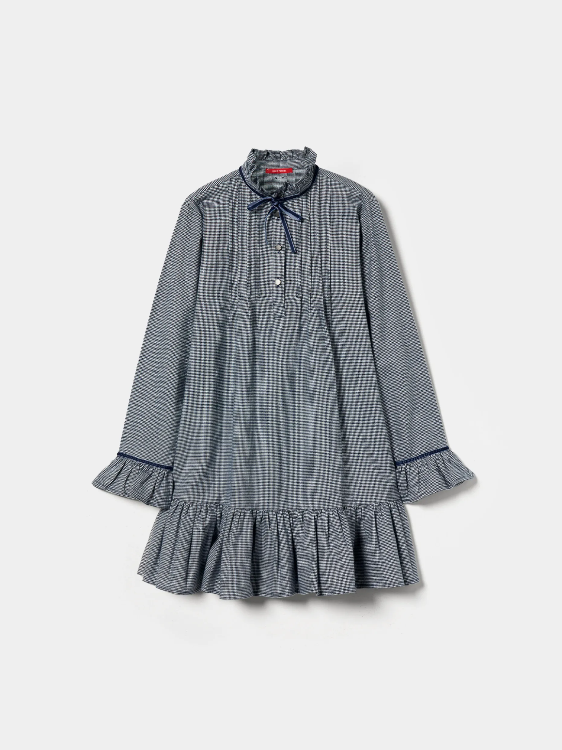 Vestido manga comprida em vichy com botões personalizados na frente. Fita de veludo em contraste na gola e nos punhos. Placa personalizada nas costas perto da gola.